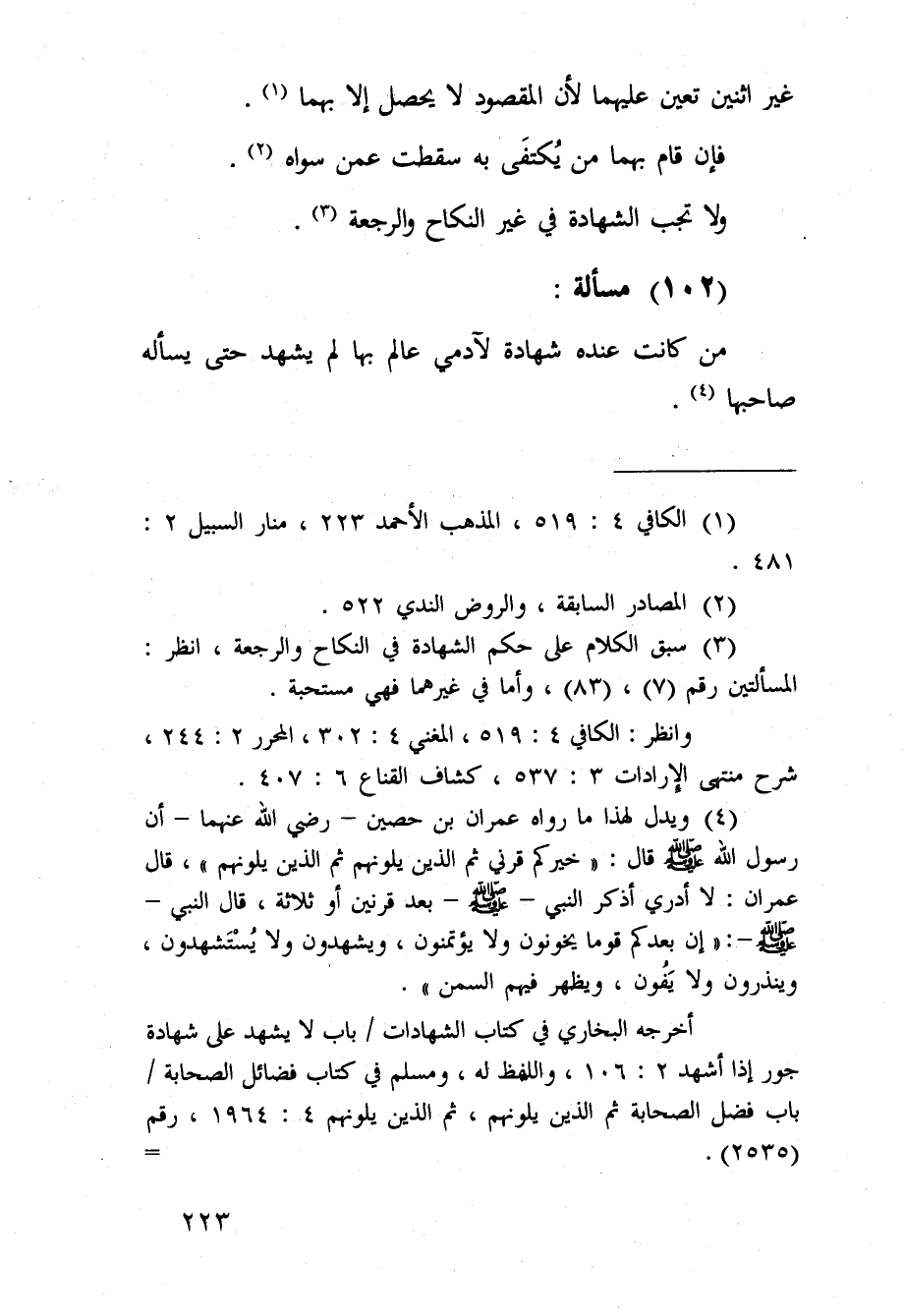 (3) سبق الكلام على حكم الشهادة في النكاح والرجعة، انظر: المسألتين رقم (7) ، (83) ، وأما في غيرهما فهي مستحبة.