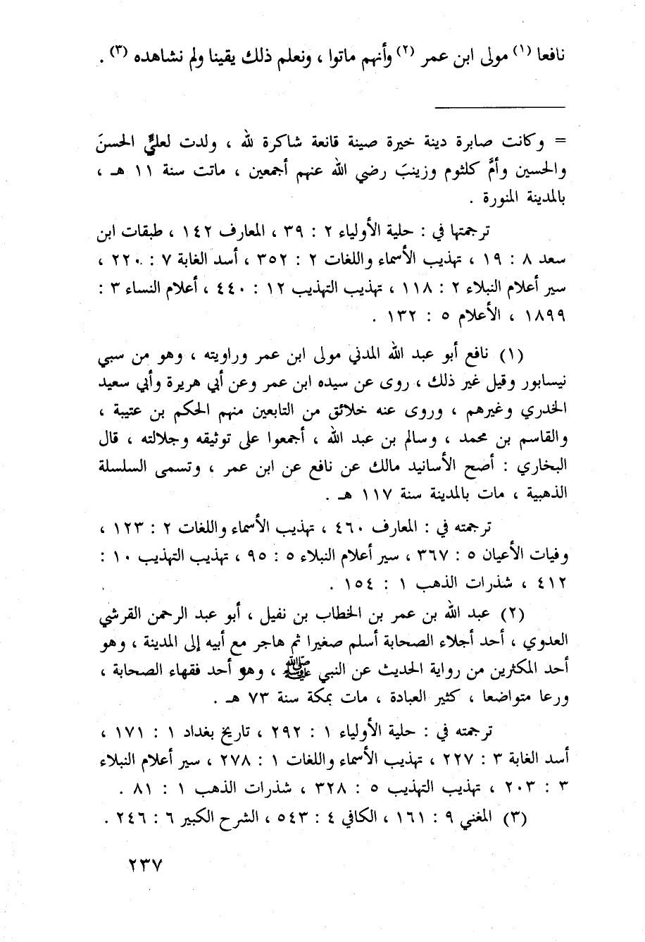 (1) نافع أبو عبد الله المدني مولى ابن عمر وراويته، وهو من سبي نيسابور وقيل غير ذلك، روى عن سيده ابن عمر وعن أبي هريرة وأبي سعيد الخدري وغيرهم، وروى عنه خلائق من التابعين، منهم الحكم بن عتيبة والقاسم بن محمد وسالم بن عبد الله، أجمعوا على توثيقه وجلالته، قال البخاري: أصح الأسانيد مالك عن نافع عن ابن عمر، وتسمى السلسلة الذهبية، مات بالمدينة سنة117هـ.