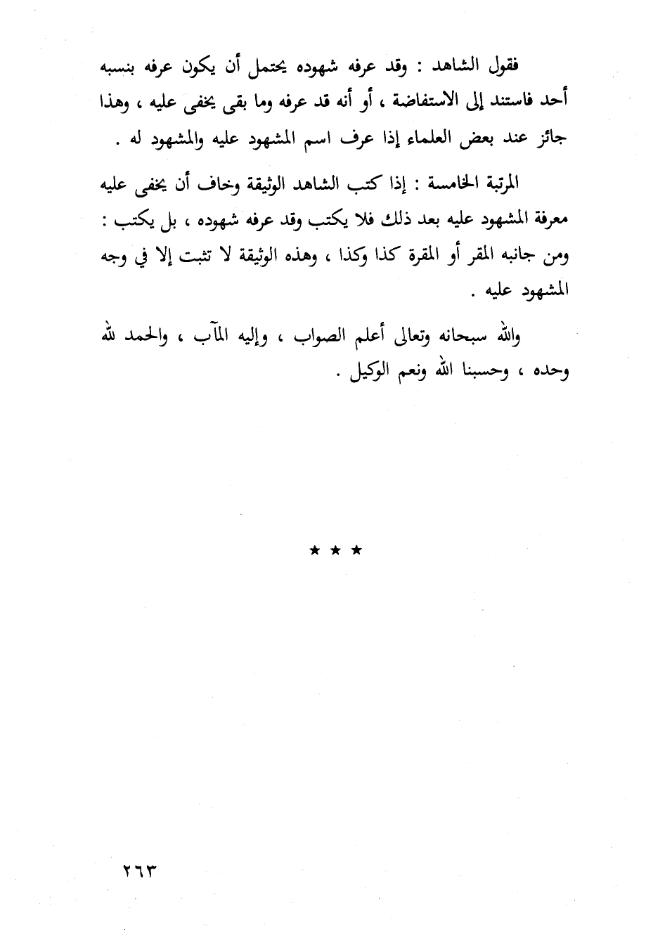المرتبة الخامسة: إذا كتب الشاهد الوثيقة وخاف أن يخفى عليه معرفة المشهود عليه بعد ذلك فلا يكتب وقد عرفه شهوده، بل يكتب: ومن جانبه المقر أو المقرة كذا وكذا، وهذه الوثيقة لا تثبت إلا في وجه المشهود عليه.