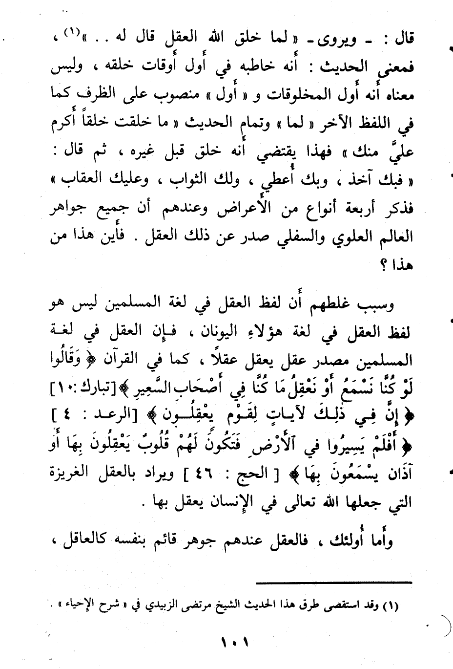 قال: - ويروى- «لما خلق الله العقل قال له..» ، فمعنى الحديث: أنه خاطبه في أول أوقات خلقه، وليس معناه أنه أول المخلوقات (وأول) منصوب على الظرف كما في اللفظ الآخر (لما) وتمام الحديث «ما خلقت خلقا أكرم علي منك» فهذا يقتضي أنه خلق قبل غيره، ثم قال: «فبك آخذ، وبك أعطي، ولك الثواب، وعليك العقاب» فذكر اربعة أنواع من الأعراض وعندهم ان جميع جواهر العالم العلوي والسفلي صدر عن ذلك العقل.