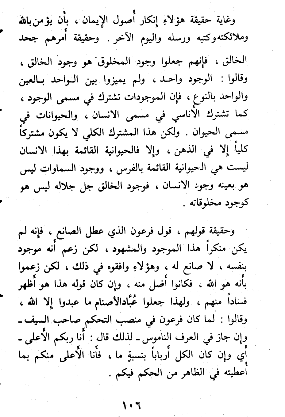 وحقيقة قولهم، قول فرعون الذي عطل الصانع، فإنه لم يكن منكرا هذا الموجود والمشهود، لكن زعم أنه موجود بنفسه، لا صانع له، وهؤلاء وافقوه في ذلك، لكن زعموا بأنه هو الله، فكانوا أضل منه وإن كان قوله هذا هو أظهر فسادا منهم، ولهذا جعلوا عباد الاصنام ما عبدوا إلا الله، وقالوا: لما كان فرعون في منصب التحكم صاحب السيف - وإن جاز في العرف الناموس - لذلك قال: أنا ربكم الأعلى - أي وأن كان الكل أربابا بنسبة ما، فأنا الأعلى منكم بما أعطيته في الظاهر من الحكم فيكم.