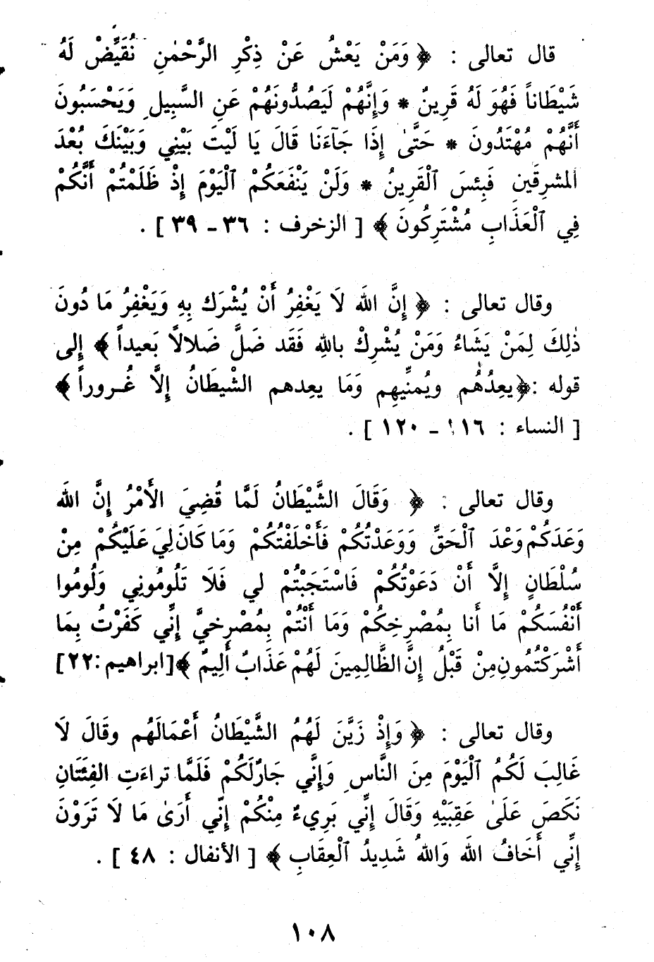 قال تعالى: {ومن يعش عن ذكر الرحمن نقيض له شيطانا فهو له قرين * وإنهم ليصدونهم عن السبيل ويحسبون أنهم مهتدون * حتى إذا جاءنا قال يا ليت بيني وبينك بعد المشرقين فبئس القرين * ولن ينفعكم اليوم إذ ظلمتم أنكم في العذاب مشتركون} وقال تعالى: {إن الله لا يغفر أن يشرك به ويغفر ما دون ذلك لمن يشاء ومن يشرك بالله فقد ضل ضلالا بعيدا} إلى قوله: {يعدهم ويمنيهم وما يعدهم الشيطان إلا غرورا} وقال تعالى: {وقال الشيطان لما قضي الأمر إن الله وعدكم وعد الحق ووعدتكم فأخلفتكم وما كان لي عليكم من سلطان إلا أن دعوتكم فاستجبتم لي فلا تلوموني ولوموا أنفسكم ما أنا بمصرخكم وما أنتم بمصرخي إني كفرت بما أشركتمون من قبل إن الظالمين لهم عذاب أليم} وقال تعالى: {وإذ زين لهم الشيطان أعمالهم وقال لا غالب لكم اليوم من الناس وإني جار لكم فلما تراءت الفئتان نكص على عقبيه وقال إني بريء منكم إني أرى ما لا ترون إني أخاف الله والله شديد العقاب} .