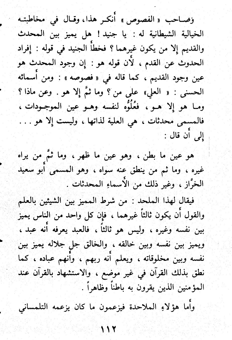 وصاحب الفصوص أنكر هذا وقال في مخاطبته الخيالية الشيطانية له: يا جنيد ! هل يميز بين المحدث والقديم إلا من يكون غيرهما؟ فخطأ الجنيد في قوله: إفراد الحدوث عن القدم، لأن قوله هو: إن وجود المحدث هو عين وجود القديم، كما قاله في فصوصه: ومن أسمائه الحسنى: (العلي) على من؟ وما ثم إلا هو.