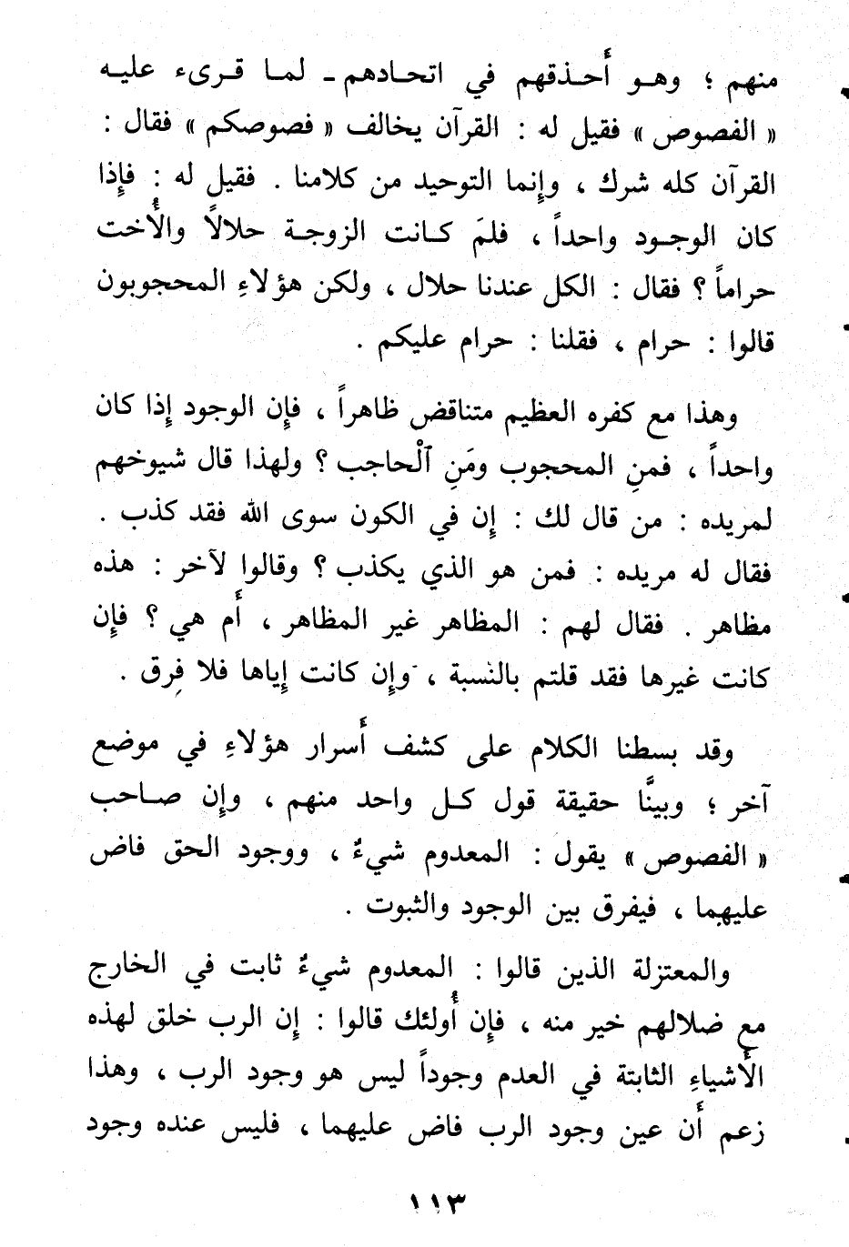 منهم، وهو أحذقهم في اتحادهم - لما قرىء عليه الفصوص فقيل له القرآن يخالف فصوصكم فقال: القرآن كله شرك، وإنما التوحيد في كلامنا، فقيل له: فإذا كان الوجود واحدا، فلم كانت الزوجة حلالا والأخت حراما؟ فقال: الكل عندنا حلال، ولكن هؤلاء المحجوبون قالوا: حرام، فقلنا: حرام عليكم.