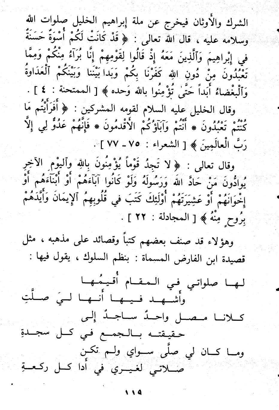وقال تعالى: {لا تجد قوما يؤمنون بالله واليوم الآخر يوادون من حاد الله ورسوله ولو كانوا آباءهم أو أبناءهم أو إخوانهم أو عشيرتهم أولئك كتب في قلوبهم الإيمان وأيدهم بروح منه} ، وهؤلاء قد صنف بعضهم كتبا وقصائد على مذهبه، مثل قصيدة ابن الفارض المسماة: بنظم السلوك، يقول فيها: