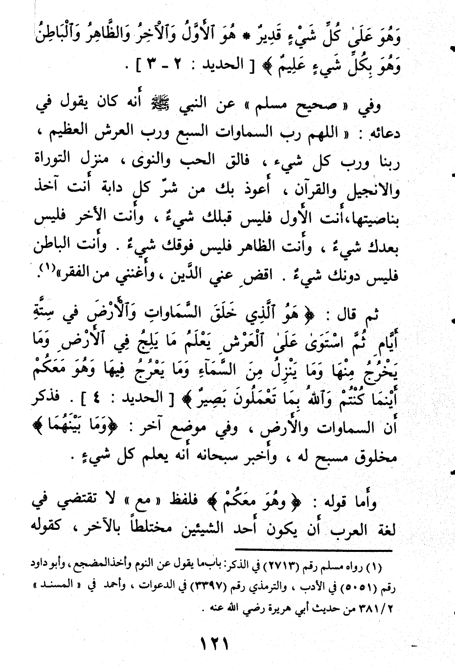 وفي صحيح مسلم «عن النبي صلىالله عليه وسلم أنه كان يقول في دعائه: اللهم رب السماوات السبع ورب العرش العظيم، ربنا ورب كل شيء، فالق الحب والنوى، منزل التوراة والانجيل والقرآن، أعوذ بك من شر كل دابة أنت آخذ بناصيتها أنت الأول فليس قبلك شيء، وأنت الآخر فليس بعدك شيء، وأنت الظاهر فليس فوقك شيء.
