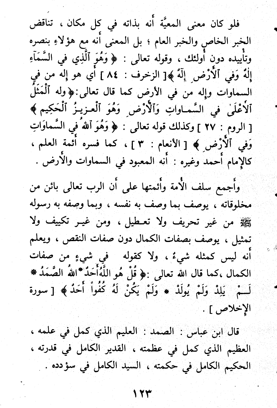 وقال ابن عباس: الصمد: العليم الذي كمل في علمه، والعظيم الذي كمل في عظمته، القدير الكامل في قدرته، الحكيم الكامل في حكمته، السيد الكامل في سؤدده.