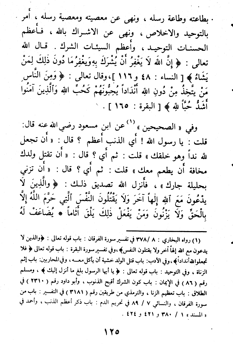 وفي الصحيحين «عن ابن مسعود رضي الله عنه قال: قلت: يا رسول الله! أي الذنب أعظم؟ قال: أن تجعل لله ندا وهو خلقك، قلت: ثم أي؟ قال: أن تقتل ولدك مخافة أن يطعم معك، قلت: ثم أي؟ قال: أن تزني بحليلة جارك» ، فأنزل الله تصديق ذلك: {والذين لا يدعون مع الله إلها آخر ولا يقتلون النفس التي حرم الله إلا بالحق ولا يزنون ومن يفعل ذلك يلق أثاما * يضاعف له