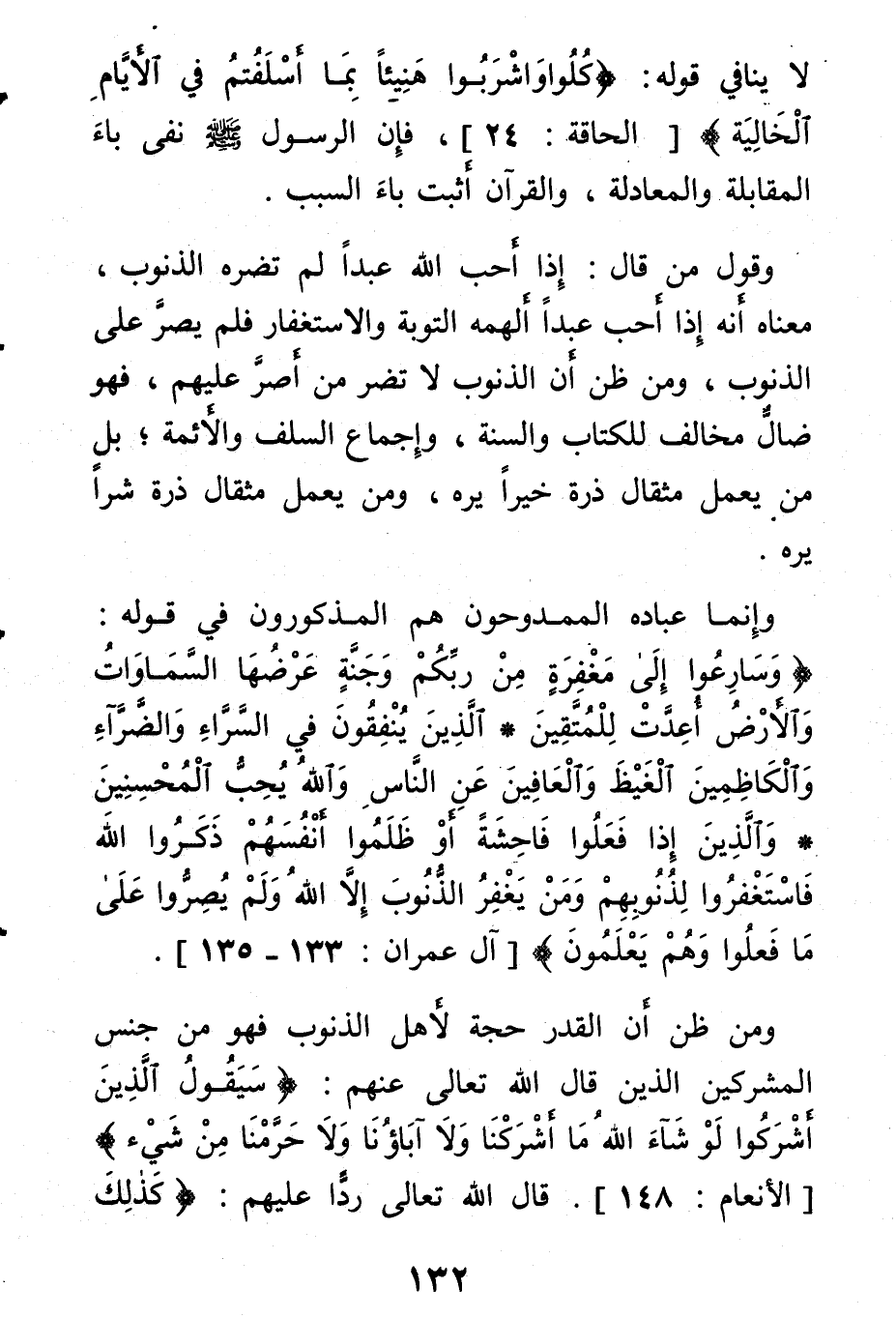 وقول من قال: إذا أحب الله عبدا لم تضره الذنوب، معناه أنه إذا أحب عبدا ألهمه التوبة والأستغفار فلم يصر على الذنوب، ومن ظن أن الذنوب لا تضر من أصر عليها، فهو ضال مخالف للكتاب والسنة، وإجماع السلف والأئمة، بل من يعمل مثقال ذرة خيرا يره، ومن يعمل مثقال ذرة شرا يره.