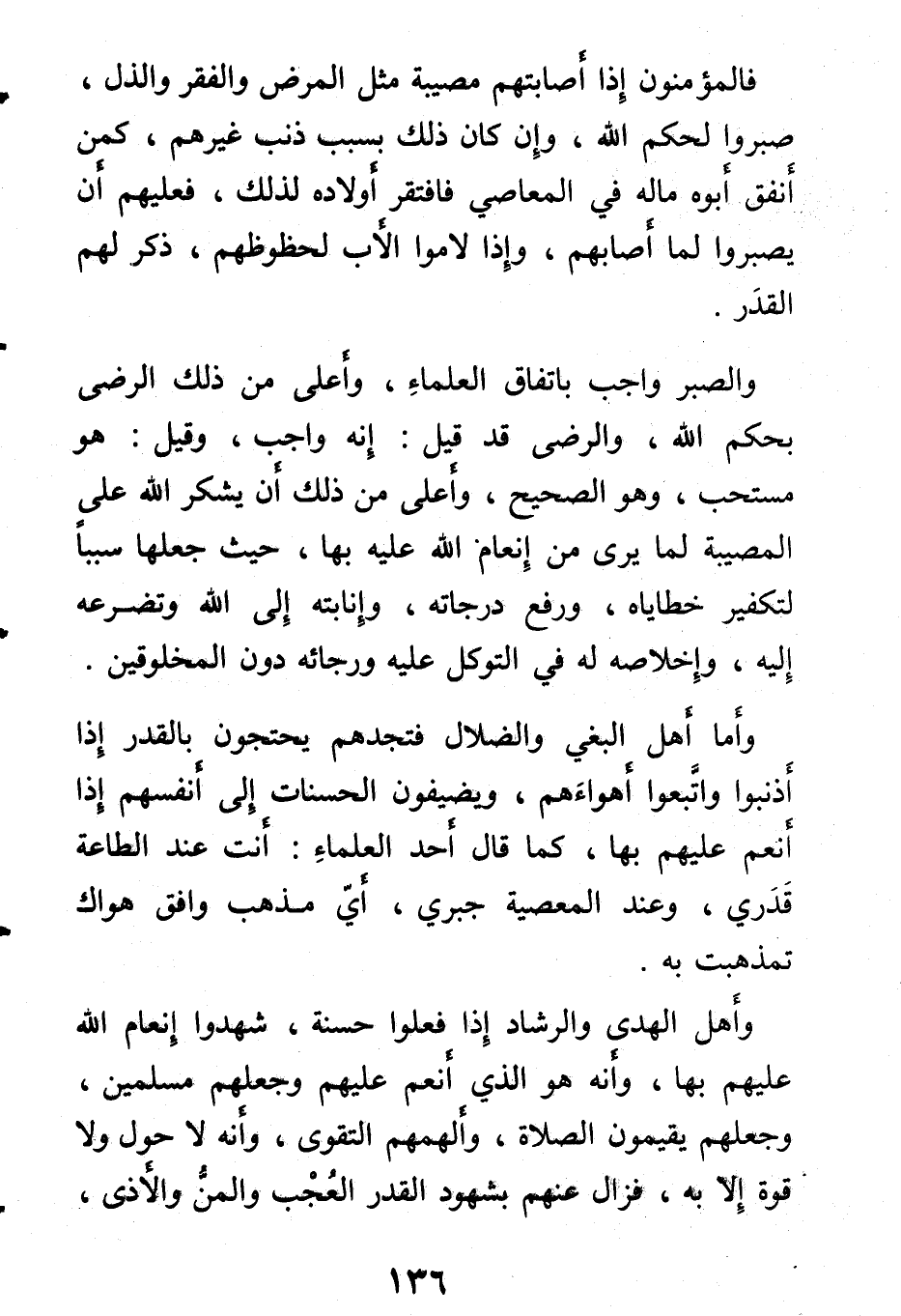 والصبر واجب باتفاق العلماء، وأعلى من ذلك الرضى بحكم الله، والرضى قد قيل: إنه واجب، وقيل: هو مستحب، وهو الصحيح، وأعلى من ذلك أن يشكر الله على المصيبة لما يرى من إنعام الله عليه بها، جعلها سببا لتكفير خطاياه، ورفع درجته، وإنابته إلى الله وتضرعه إليه، وإخلاصه له في التوكل عليه ورجائه دون المخلوقين.