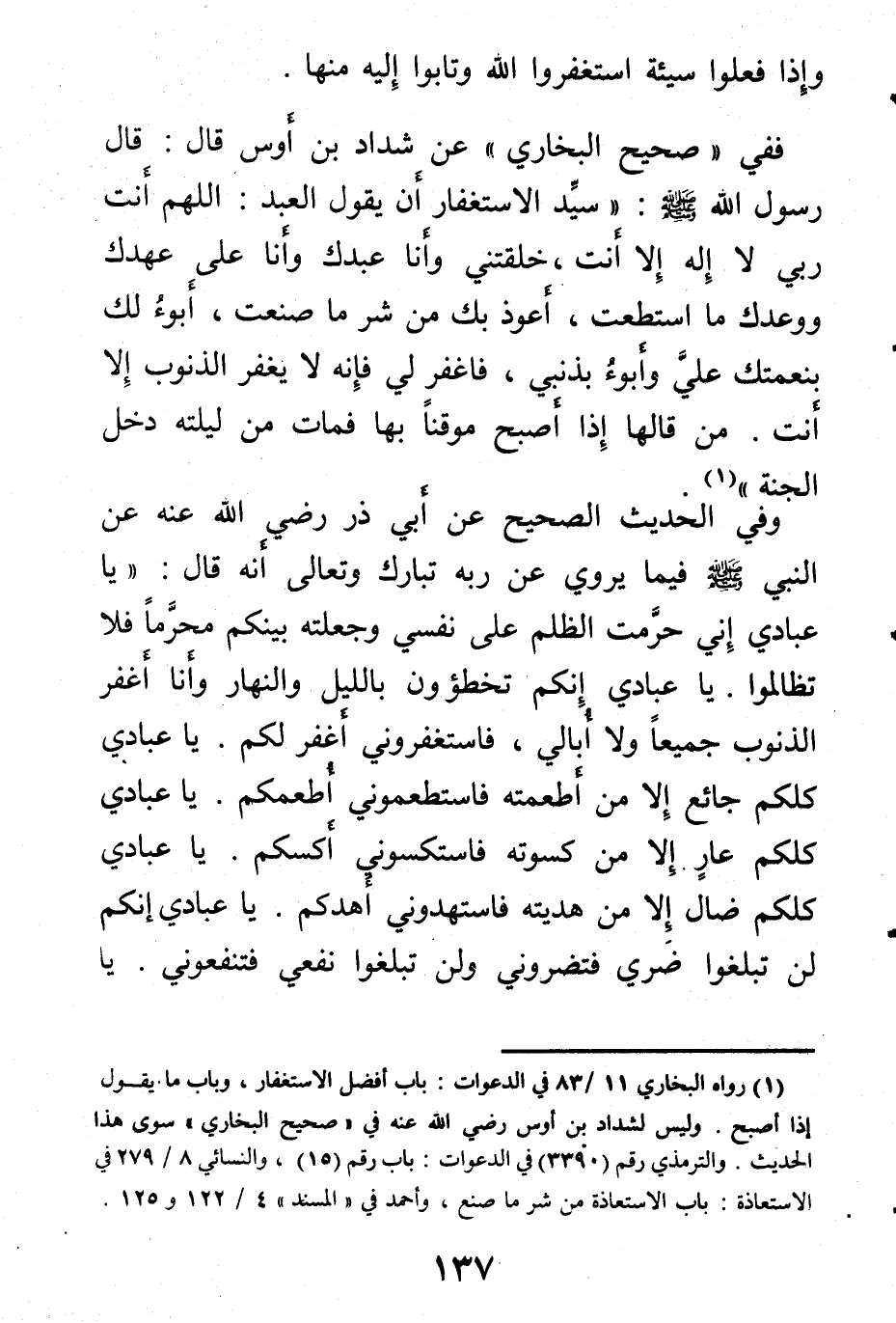 ففي صحيح البخاري عن شداد بن أوس قال: قال رسول الله صلى الله عليه وسلم: «سيد الاستغفار أن يقول العبد: اللهم أنت ربي لا إله إلا أنت خلقتني وأن عبدك وأنا على عهدك ووعدك ما استطعت، أعوذ بك من شر ما صنعت، أبوء لك بنعمتك علي وأبوء بذنبي، فاغفر لي فأنه لا يغفر الذنوب إلا أنت.