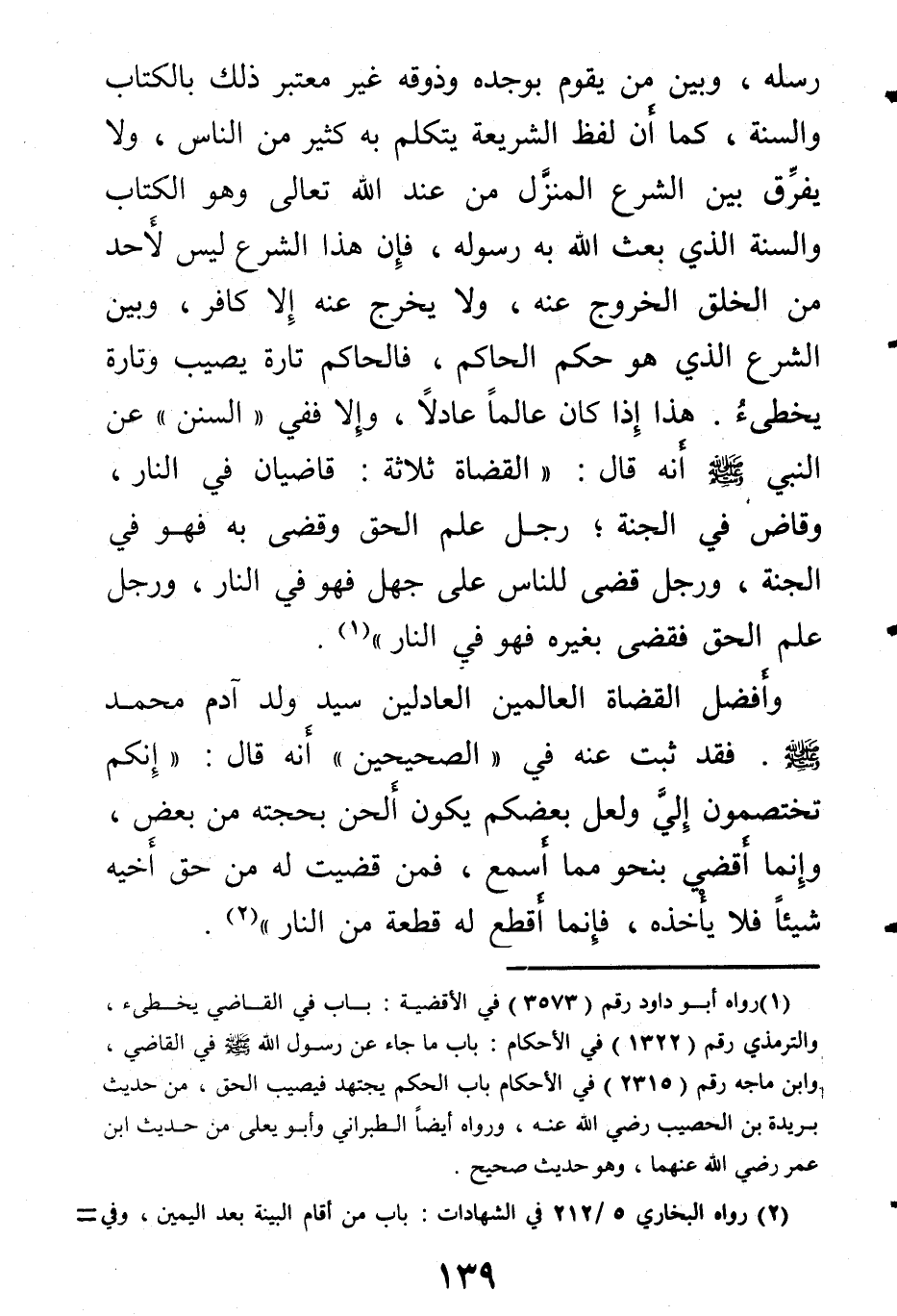 وإلا ففي السنن عن النبي صلى الله عليه وسلم أنه قال: «القضاة ثلاثة: قاضيان في النار، وقاض في الجنة، رجل علم الحق وقضى به فهو في الجنة، ورجل قضى للناس على جهل فهو في النار، ورجل علم الحق فقضى بغيره فهو في النار» .
