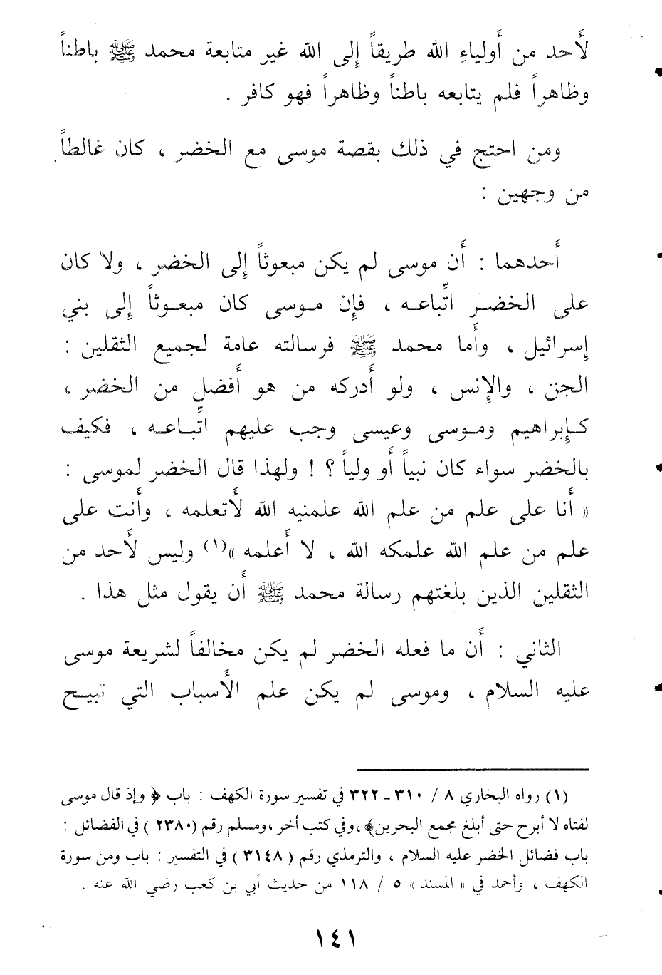 ومن احتج في ذلك بقصة موسى مع الخضر، كان غالطا من وجهين: أحدهما: أن موسى لم يكن مبعوثا إلى الخضر، ولا كان على الخضر اتباعه، فإن موسى كان مبعوثا إلى بني إسرائيل، وأما محمد صلى الله عليه وسلم فرسالته عامة لجميع الثقلين: الجن، والأنس، ولو أدركه من هو أفضل من الخضر، كإبراهيم وموسى وعيسى وجب عليهم اتباعه، فكيف بالخضر سواء كان نبيا أو وليا؟! ولهذا قال الخضر لموسى: (أنا على علم من علم الله علمنيه الله لا تعلمه، وأنت على علم من علم الله علمكه الله، لا أعلمه) وليس لأحد من الثقلين الذين بلغتهم رسالة محمد صلى الله عليه وسلم أن يقول مثل هذا.