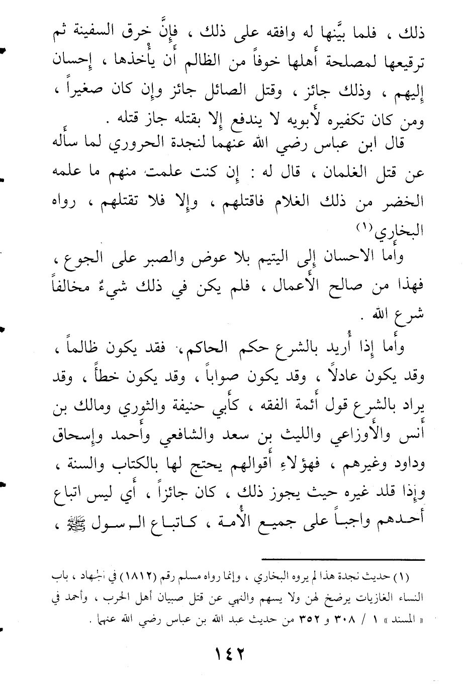 قال ابن عباس رضي الله عنهما لنجدة الحروري لما سأله عن قتل الغلمان، قال له: إن كنت علمت منهم ما علمه الخضر من ذلك الغلام فاقتلهم، وإلا فلا تقتلهم، رواه البخاري.