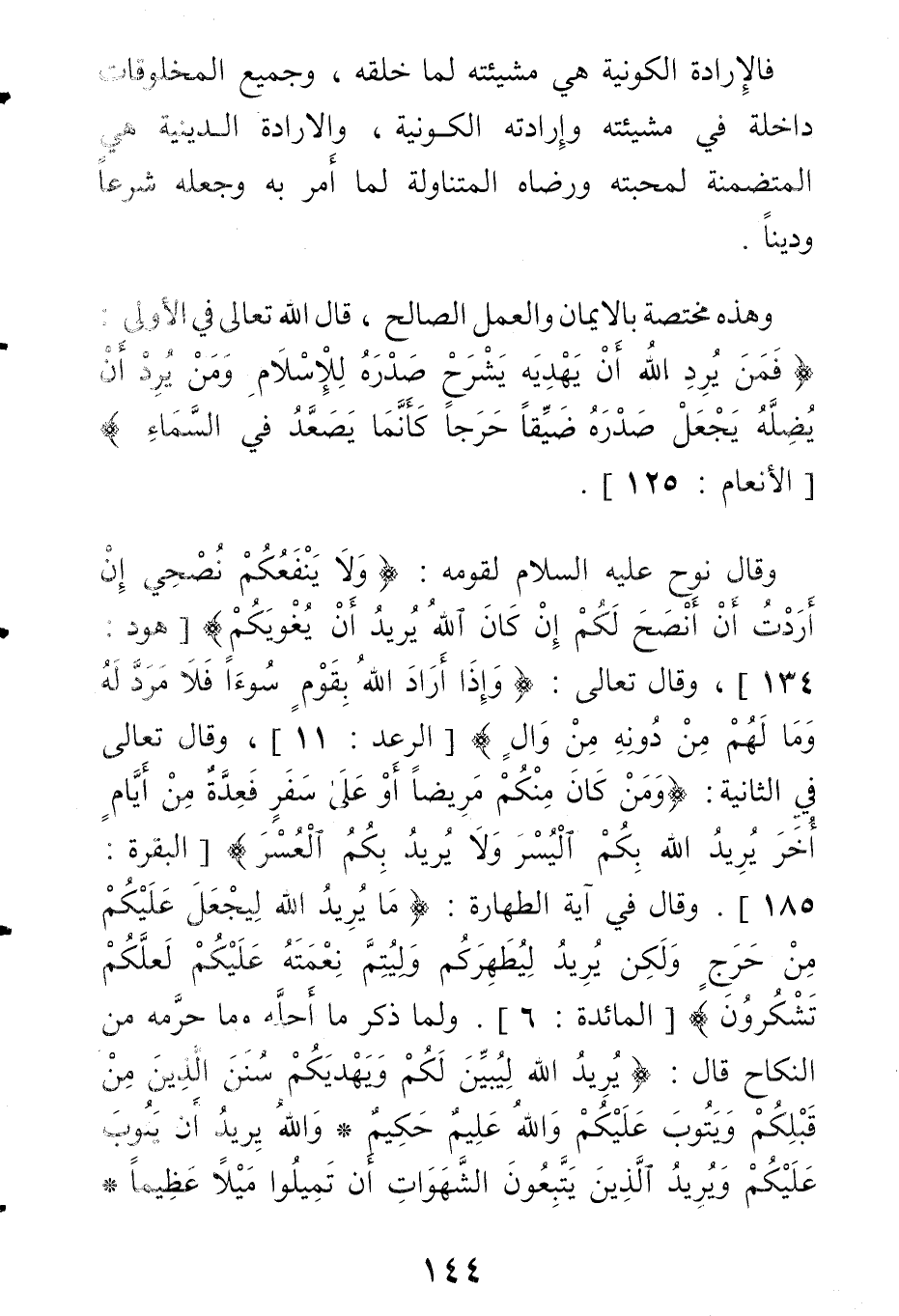 وقال نوح عليه السلام لقومه: {ولا ينفعكم نصحي إن أردت أن أنصح لكم إن كان الله يريد أن يغويكم} ، وقال تعالى: {وإذا أراد الله بقوم سوءا فلا مرد له وما لهم من دونه من وال} ، وقال تعالى في الثانية: {ومن كان مريضا أو على سفر فعدة من أيام أخر يريد الله بكم اليسر ولا يريد بكم العسر} .