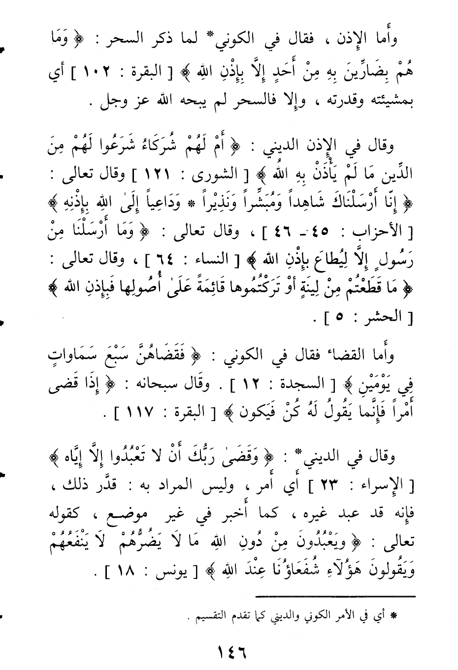 وقال في الإذن الديني: {أم لهم شركاء شرعوا لهم من الدين ما لم يأذن به الله} وقال تعالى: {إنا أرسلناك شاهدا ومبشرا ونذيرا * وداعيا إلى الله بإذنه} ، وقال تعالى: {وما أرسلنا من رسول إلا ليطاع بإذن الله} ، وقال تعالى: {ما قطعتم من لينة أو تركتموها قائمة على أصولها فبإذن الله} وأما القضاء فقال في الكوني: {فقضاهن سبع سماوات في يومين} ، وقال سبحانه: {إذا قضى أمرا فإنما يقول له كن فيكون} .
