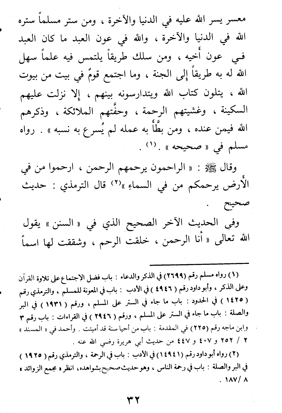 معسر يسر الله عليه في الدنيا والأخرة، ومن ستر مسلما ستره الله في الدنيا والآخرة، والله في عون العبد ما كان العبد في، عون أخيه ومن سلك طريقا يلتمس فيه علما سهل الله به طريقا إلى الجنة، وما اجتمع قوم في بيت من بيوت الله، يتلون كتاب الله ويتدارسونه بينهم، إلا نزلت عليهم السكينة، وغشيتهم الرحمة، وحفتهم الملائكة، وذكرهم الله فيمن عنده، ومن بطأ به عمله لم يسرع به نسبه» .