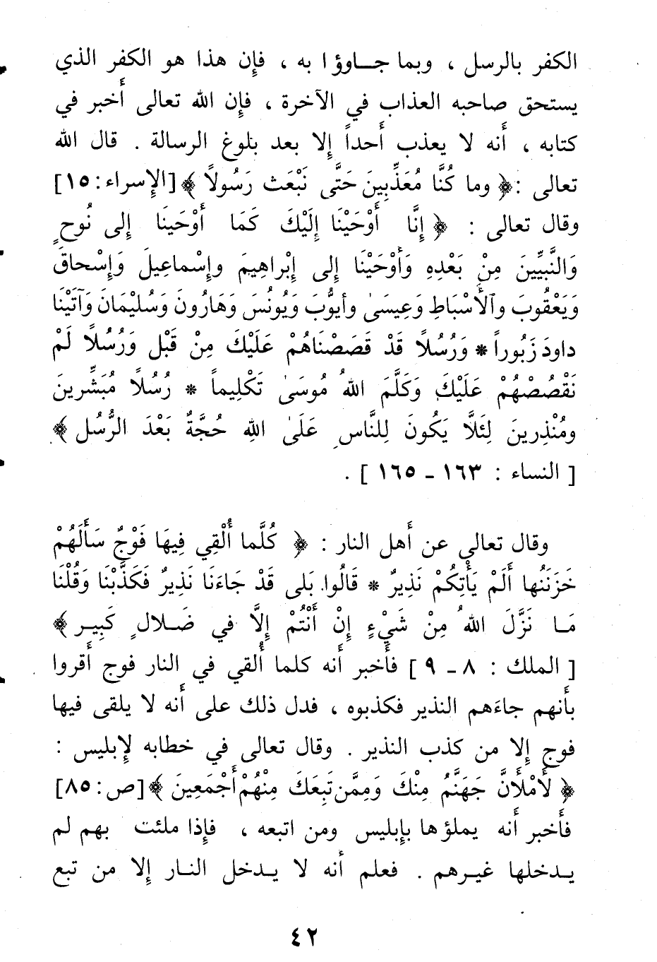 قال الله تعالى: {وما كنا معذبين حتى نبعث رسولا} وقال تعالى: {إنا أوحينا إليك كما أوحينا إلى نوح والنبيين من بعده وأوحينا إلى إبراهيم وإسماعيل وإسحاق ويعقوب والأسباط وعيسى وأيوب ويونس وهارون وسليمان وآتينا داود زبورا * ورسلا قد قصصناهم عليك من قبل ورسلا لم نقصصهم عليك وكلم الله موسى تكليما * رسلا مبشرين ومنذرين لئلا يكون للناس على الله حجة بعد الرسل} وقال تعالى عن أهل النار: {كلما ألقي فيها فوج سألهم خزنتها ألم يأتكم نذير * قالوا بلى قد جاءنا نذير فكذبنا وقلنا ما نزل الله من شيء إن أنتم إلا في ضلال كبير}