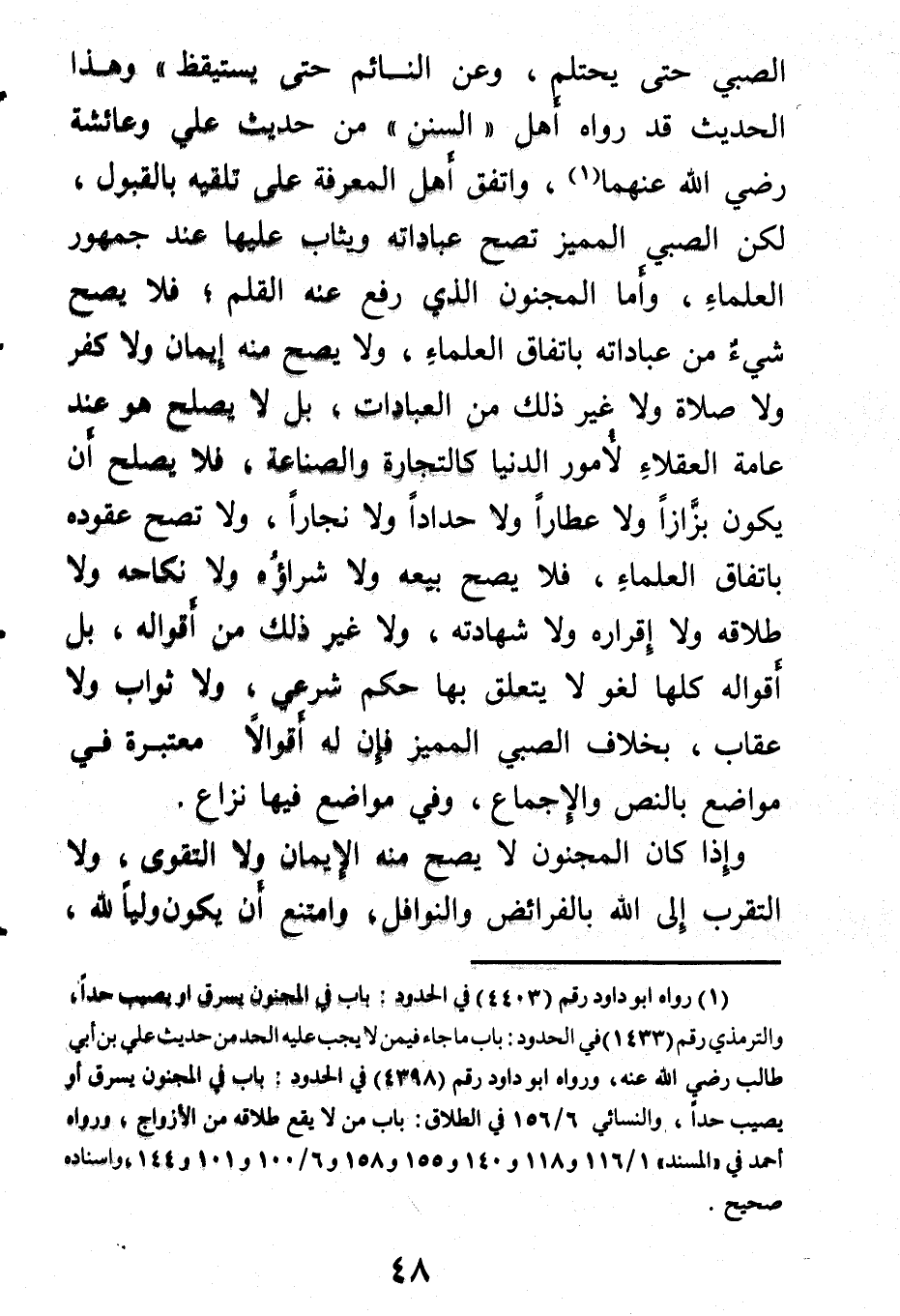 وهذا الحديث قد رواه أهل السنن من حديث علي وعائشة رضي الله عنهما، واتفق أهل المعرفة على تلقيه بالقبول، لكن الصبي المميز تصح عباداته ويثاب عليها عند جمهور العلماء، وأما المجنون الذي رفع عنه القلم، فلا يصح شيء من عباداته باتفاق العلماء، ولا يصح منه إيمان ولا كفر ولا صلاة ولا غير ذلك من العبادات، ولا يصلح هو عند عامة العقلاء لأمور الدنيا كالتجارة والصناعة، فلا يصلح أن يكون بزازا ولا عطارا ولا حدادا ولا نجارا، ولا تصح عقوده باتفاق العلماء، فلا يصح بيعه ولا شراؤه ولا نكاحه ولا طلاقه ولا إقراره ولا شهادته، ولا غير ذلك من أقواله، بل أقواله كلها لغو لا يتعلق بها حكم شرعي، ولا ثواب ولا عقاب، بخلاف الصبي المميز فإن له أقوالا معتبرة في مواضع بالنص والإجماع، وفي مواضع فيها نزاع.
