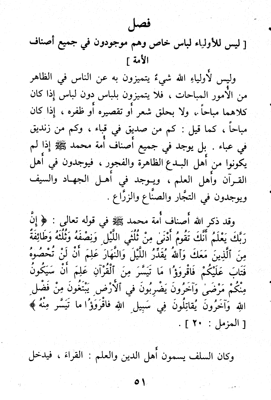 وليس لأولياء الله شيء يتميزون به عن الناس في الظاهر من الأمور المباحات، فلا يتميزون بلباس دون لباس إذا كان كلاهما مباحا، ولا بحلق شعر أو تقصيره أو ظفره، إذا كان مباحا، كما قيل: كم من صديق في قباء، وكم من زنديق في عباء.