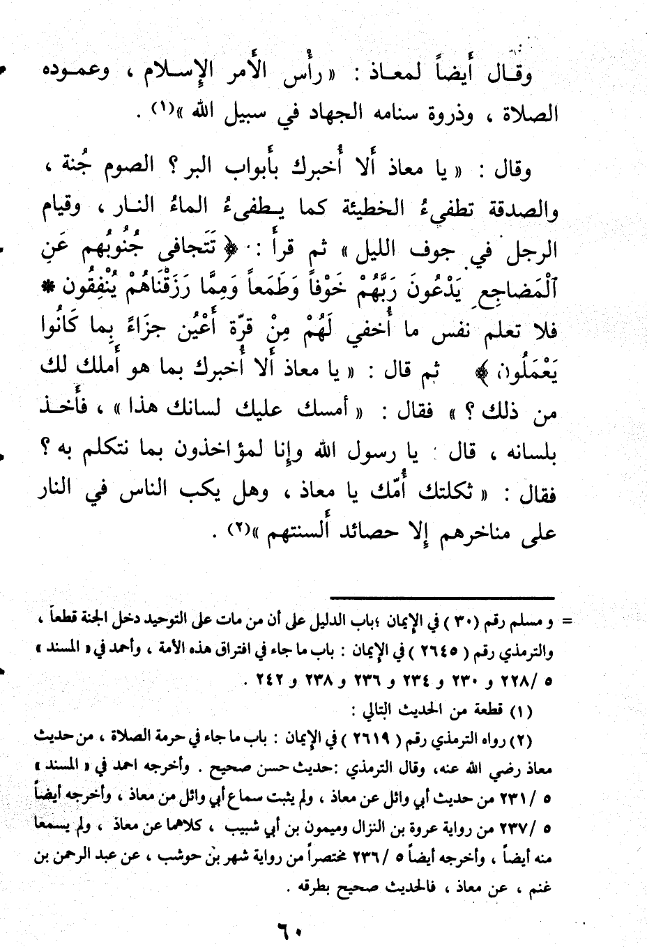 وقال أيضا لمعاذ: «رأس الأمر الإسلام، وعموده الصلاة، وذروة سنامه الجهاد في سبيل الله» وقال: «يا معاذ ألا أخبرك بأبواب البر؟ الصوم جنة، والصدقة تطفئ الخطيئة كما يطفئ الماء النار، وقيام الرجل في جوف الليل ثم قرأ: {تتجافى جنوبهم عن المضاجع يدعون ربهم خوفا وطمعا ومما رزقناهم ينفقون * فلا تعلم نفس ما أخفي لهم من قرة أعين جزاء بما كانوا يعملون} ثم قال: يا معاذ ألا أخبرك بما هو أملك لك من ذلك؟ فقال: امسك عليك لسانك هذا، فأخذ بلسانه، قال: يا رسول الله وإنا لمؤخذون بما نتكلم به؟ فقال: ثكلتك أمك يا معاذ، وهل يكب الناس في النار على مناخرهم إلا حصائد ألسنتهم» .