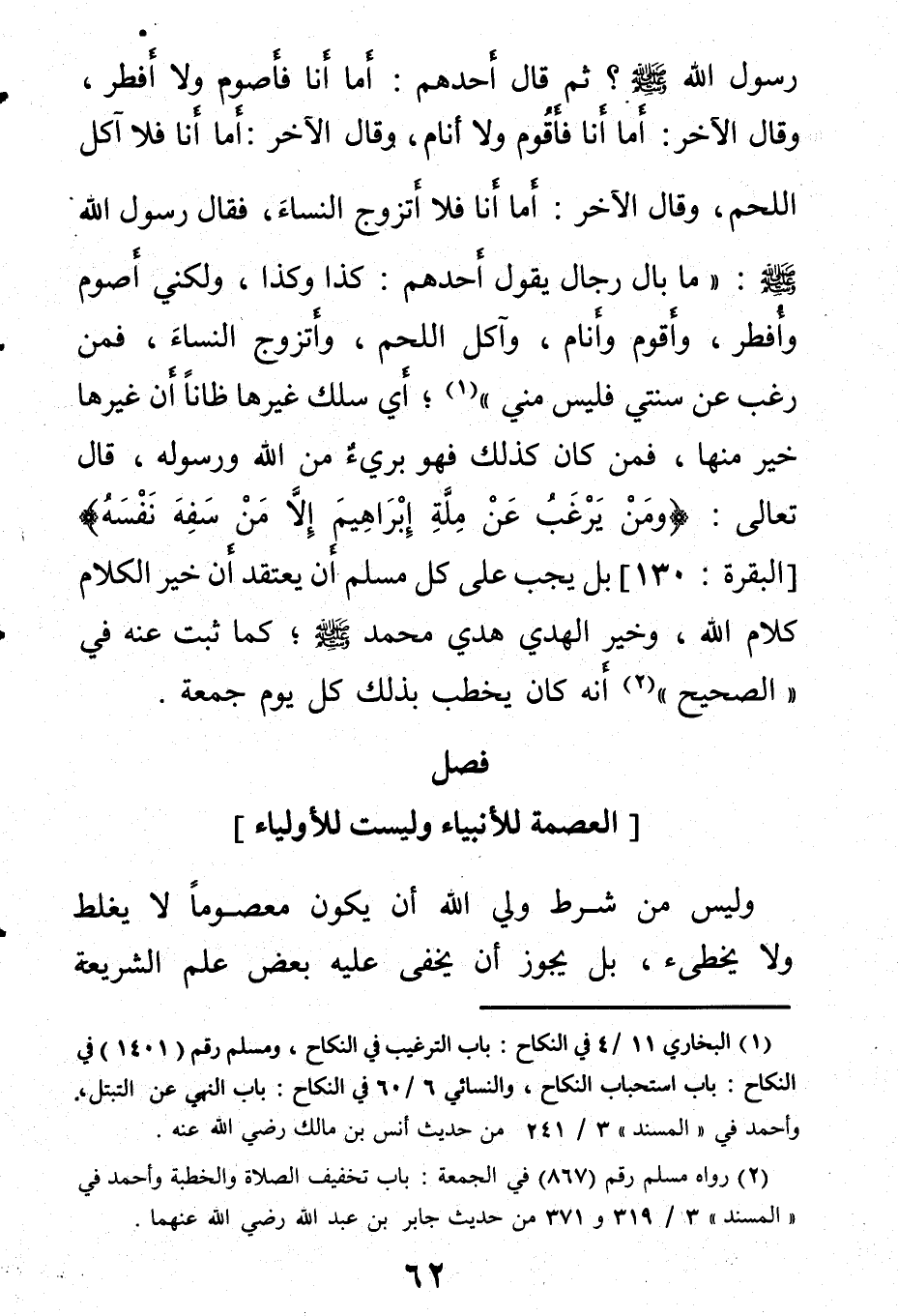 رسول الله صلى الله عليه وسلم؟ ثم قال أحدهم: أما أنا فأصوم ولا أفطر، وقال الآخر: أما أنا فأقوم ولا أنام، وقال الآخر: أما أنا فلا آكل اللحم، وقال الاخر: أما أنا فلا أتزوج النساء، فقال رسول الله صلى الله عليه وسلم: «ما بال رجال يقول أحدهم: كذا وكذا ولكني أصوم وأفطر، وأقوم وأنام، وآكل اللحم، وأتزوج النساء، فمن رغب عن سنتي فليس مني» ، أي سلك غيرها ظانا أن غيرها خير منها فمن كان كذلك فهو بريء من الله ورسوله، وقال تعالى: {ومن يرغب عن ملة إبراهيم إلا من سفه نفسه} بل يجب على كل مسلم أن يعتقد أن خير الكلام كلام الله، وخير الهدى هدي محمد صلى الله عليه وسلم، كما ثبت عنه في الصحيح أنه كان يخطب بذلك كل يوم جمعة.