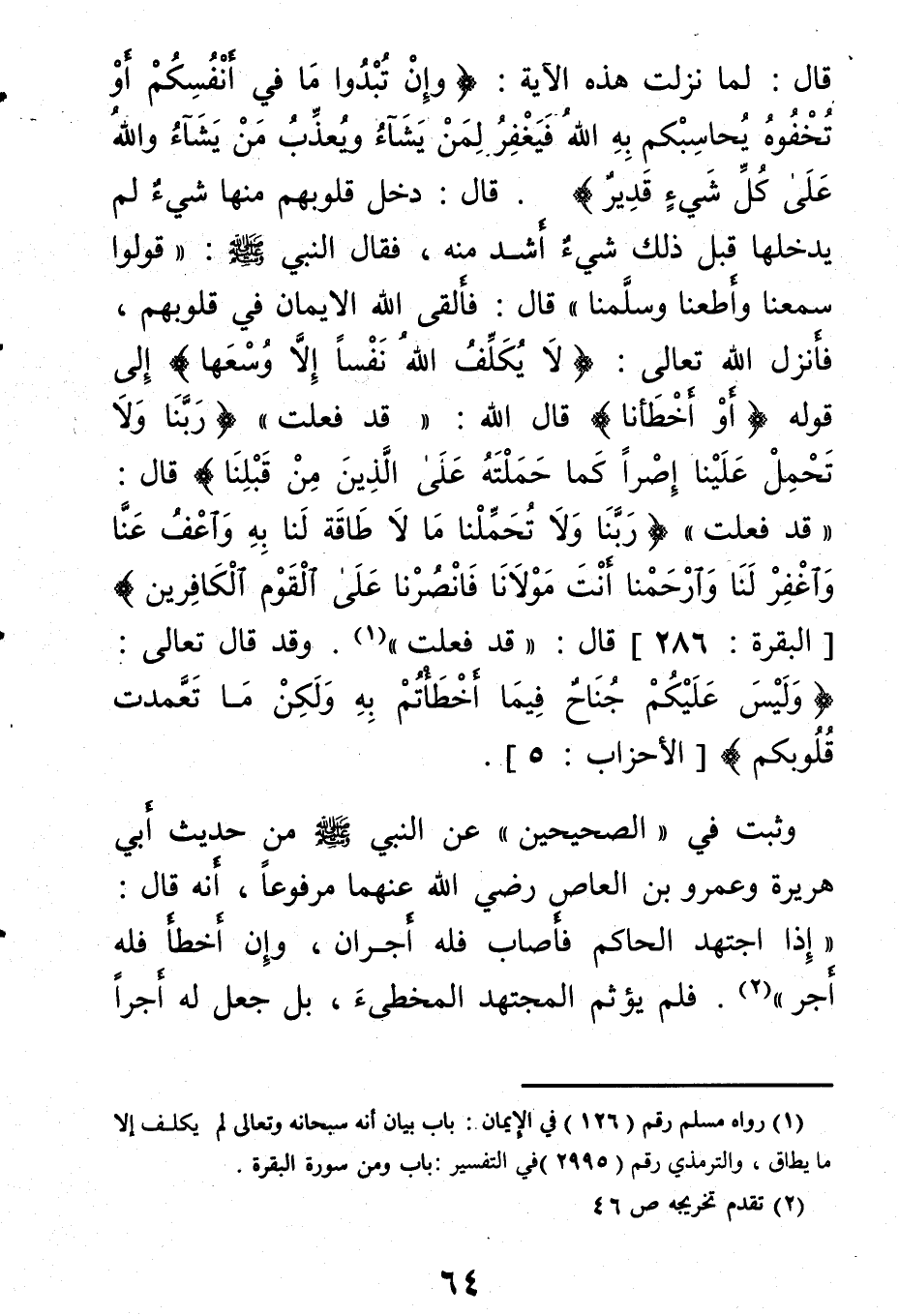 قال: دخل قلوبهم منها شيء لم يدخلها قبل ذلك شيء أشد منه، فقال النبي صلى الله عليه وسلم: قولوا سمعنا وأطعنا وسلمنا قال: فألقى الله الايمان في قلوبهم فأنزل الله تعالى: {لا يكلف الله نفسا إلا وسعها} إلى قوله {أو أخطأنا} قال الله: قد فعلت {ربنا ولا تحمل علينا إصرا كما حملته على الذين من قبلنا} قال: قد فعلت {ربنا ولا تحملنا ما لا طاقة لنا به واعف عنا واغفر لنا وارحمنا أنت مولانا فانصرنا على القوم الكافرين} قال: قد فعلت.