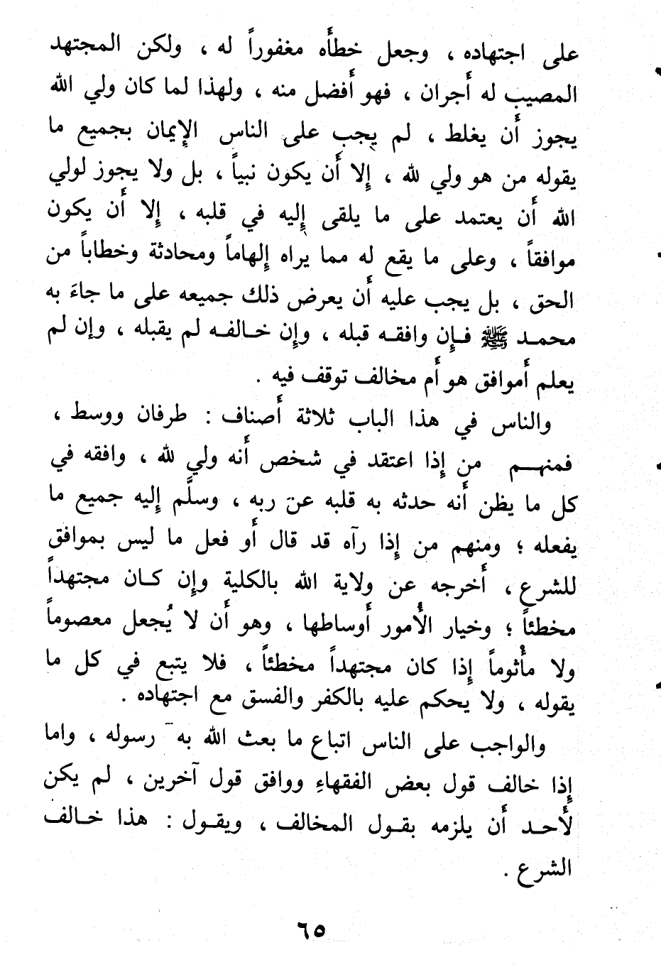والناس في هذا الباب ثلاثة أصناف: طرفان ووسط، فمنهم من من إذا اعتقد في شخص أنه ولي لله، وافقه في كل ما يظن أنه حدثه به قلبه عن ربه، وسلم إليه جميع ما يفعله، ومنهم من إذا رآه قد قال او فعل ما ليس بموافق للشرع، أخرجه عن ولاية الله بالكلية وإن كان مجتهدا مخطئا، وخيار الأمور أوساطها، وهو أن لا يجعل معصوما ولا مأثوما إذا كان مجتهدا مخطئا، فلا يتبع في كل ما يقوله، ولا يحكم عليه بالكفر والفسق مع اجتهاده.