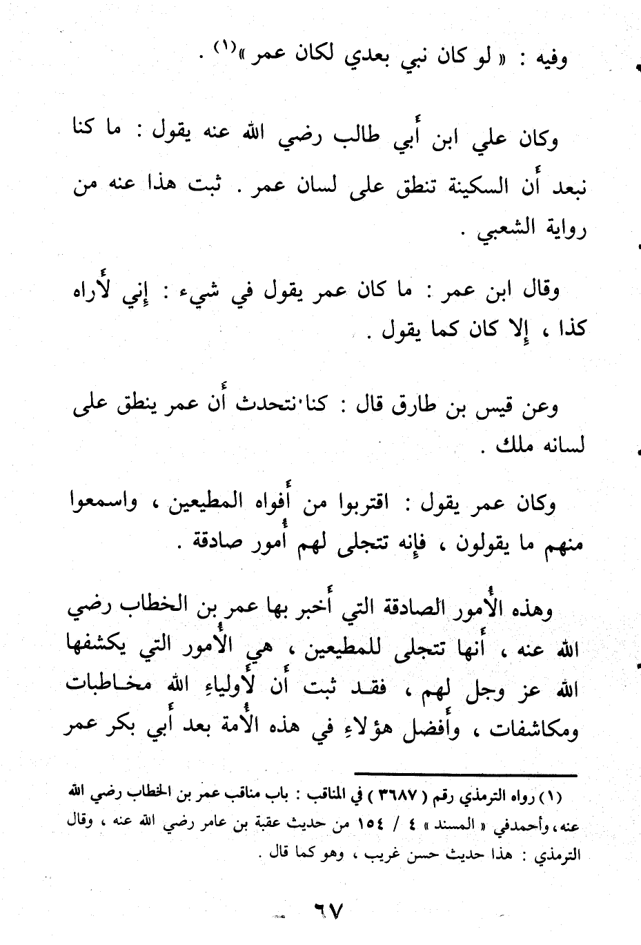 وفيه: «لو كان نبي بعدي لكان عمر» وكان علي ابن أبي طالب رضي الله عنه يقول: ما كنا نبعد أن السكينة تنطق على لسان عمر.