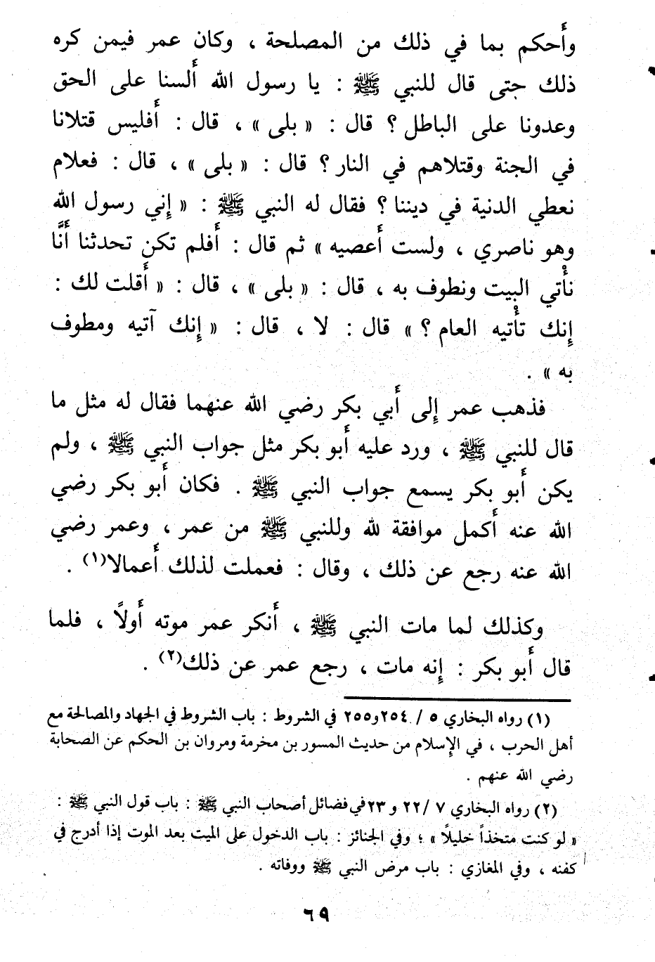 وكان عمر فيمن كره ذلك حتى قال النبي صلى الله عليه وسلم: يا رسول الله ألسنا على الحق وعدونا على الباطل؟ قال: «بلى» ، قال: أفليس قتلانا في الجنة وقتلاهم في النار؟ قال: «بلى» ، قال: فعلام نعطي الدنية في ديننا؟ فقال له النبي صلى الله عليه وسلم: «إني رسول الله وهو ناصري، ولست أعصيه» ثم قال: أفلم تكن تحدثنا أنا نأتي البيت ونطوف به، قال: «بلى» ، قال: «أقلت لك: إنك تأتيه العام؟» قال: لا، قال: «إنك آتيه ومطوف به» .