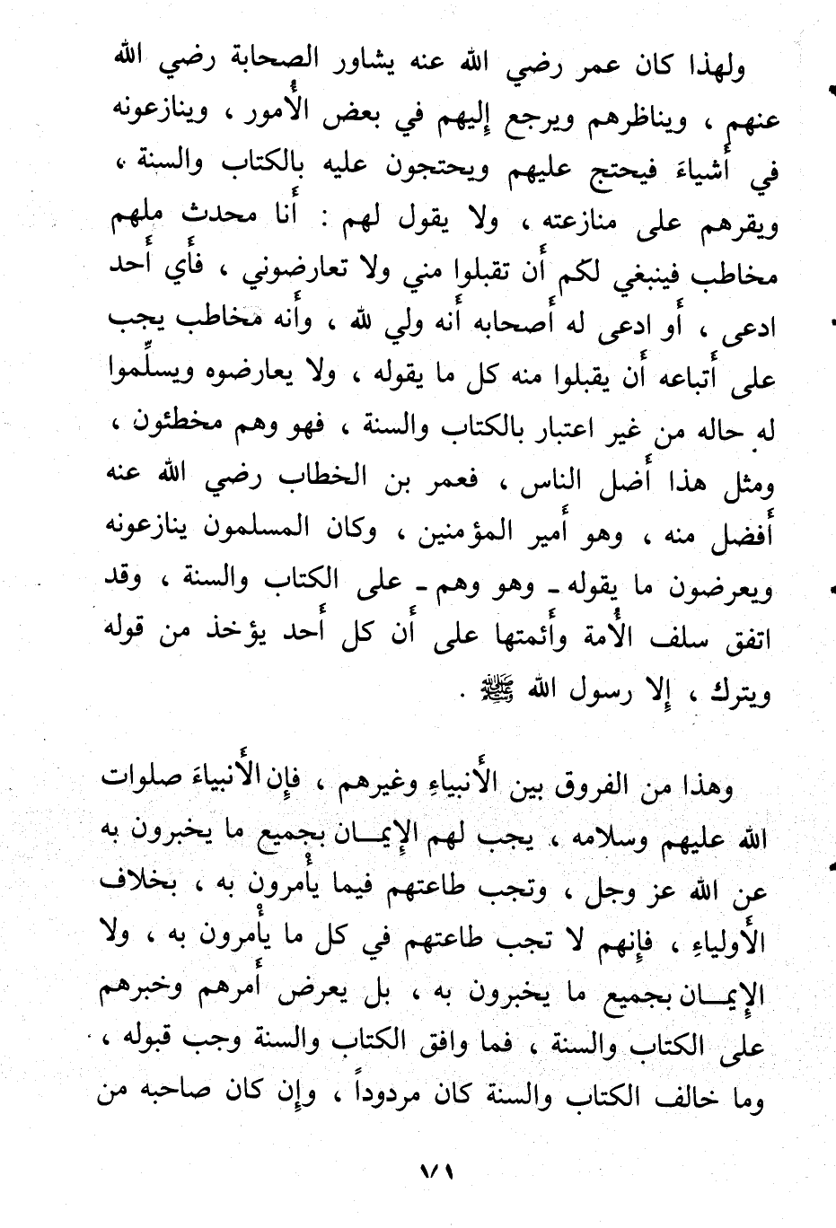 ولهذا كان عمر رضي الله عنه يشاور الصحابة رضي الله عنهم، ويناظرهم ويرجع إليهم في بعض الأمور، وينازعونه في أشياء فيحتج عليهم ويحتجون عليه بالكتاب والسنة، ويقرهم على منازعته، ولا يقول لهم: أنا محدث ملهم مخاطب فينبغي لكم أن تقبلوا مني ولا تعارضوني، فأي أحد ادعى، أو ادعى له أصحابه أنه ولي لله، وأنه مخاطب يجب على أتباعه ان يقبلوا منه كل ما يقوله، ولا يعارضوه ويسلموا له حاله من غير اعتبار بالكتاب والسنة، فهو وهم مخطئون، ومثل هذا أضل الناس، فعمر بن الخطاب رضي الله عنه أفضل منه، وهو أمير المؤمنين، وكان المسلمون ينازعونه ويعرضون ما يقوله - وهو وهم - على الكتاب والسنة، وقد اتفق سلف الأمة وأئمتها على أن كل أحد يؤخذ من قوله ويترك، إلا رسول الله صلى الله عليه وسلم.