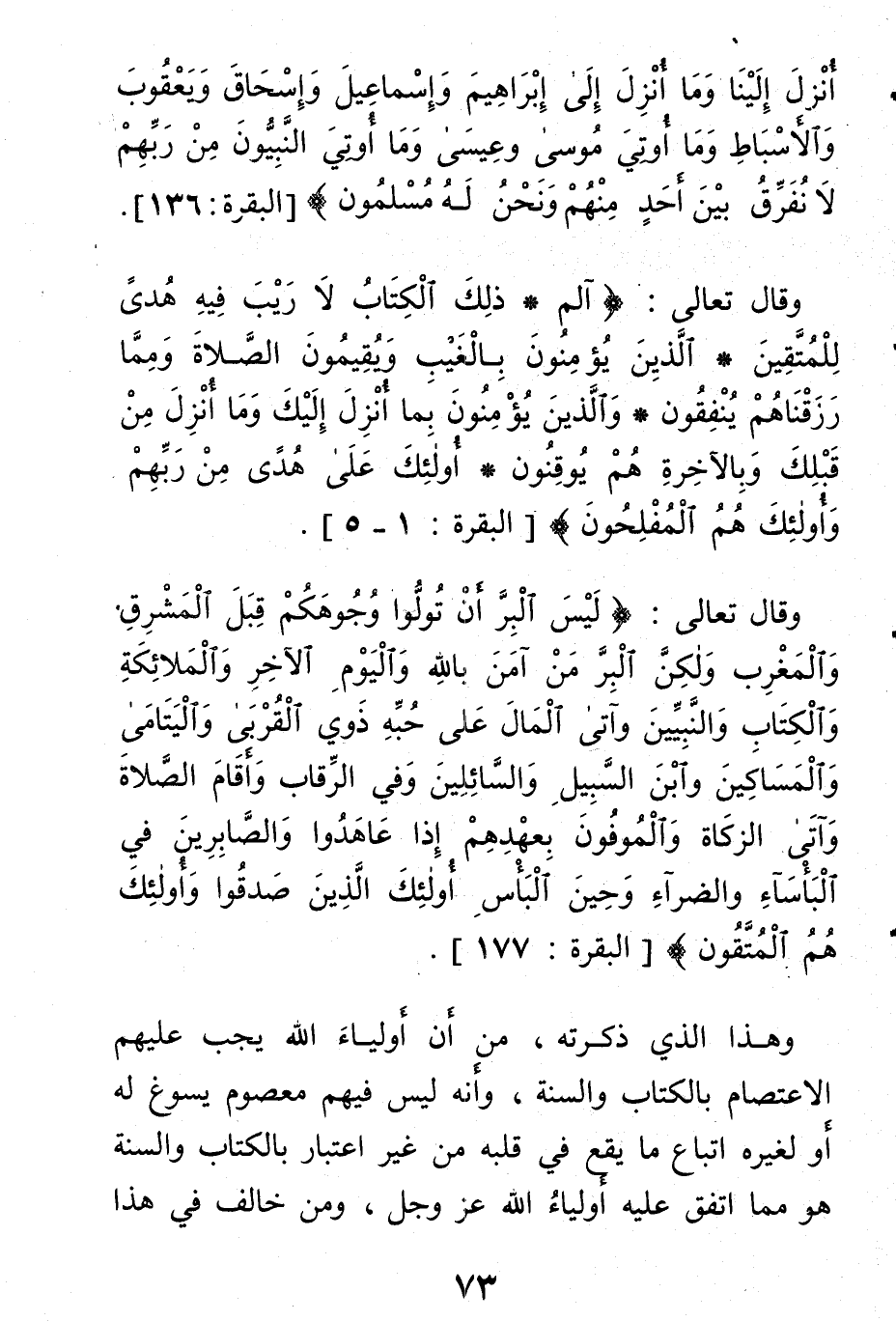 أنزل إلينا وما أنزل إلى إبراهيم وإسماعيل وإسحاق ويعقوب والأسباط وما أوتي موسى وعيسى وما أوتي النبيون من ربهم لا نفرق بين أحد منهم ونحن له مسلمون} وقال تعالى: {الم * ذلك الكتاب لا ريب فيه هدى للمتقين * الذين يؤمنون بالغيب ويقيمون الصلاة ومما رزقناهم ينفقون * والذين يؤمنون بما أنزل إليك وما أنزل من قبلك وبالآخرة هم يوقنون * أولئك على هدى من ربهم وأولئك هم المفلحون} وقال تعالى: {ليس البر أن تولوا وجوهكم قبل المشرق والمغرب ولكن البر من آمن بالله واليوم الآخر والملائكة والكتاب والنبيين وآتى المال على حبه ذوي القربى واليتامى والمساكين وابن السبيل والسائلين وفي الرقاب وأقام الصلاة وآتى الزكاة والموفون بعهدهم إذا عاهدوا والصابرين في البأساء والضراء وحين البأس أولئك الذين صدقوا وأولئك هم المتقون} .