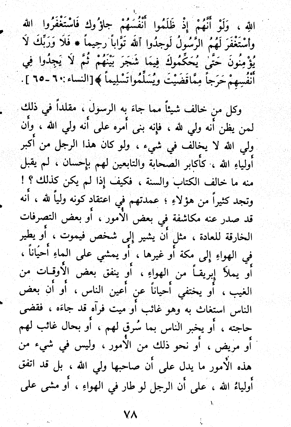 وكل من خالف شيئا مما جاء به الرسول، مقلدا في ذلك لمن يظن أنه ولي لله، فإنه بنى أمره على أنه ولي الله، وان ولي الله لا يخالف في شيء، ولو كان هذا الرجل من أكبر أولياء الله، كأكابر الصحابة والتابعين لهم بإحسان، لم يقبل منه ما خالف الكتاب والسنة، فكيف إذا لم يكن كذلك؟! وتجد كثيرا من هؤلاء، عمدتهم في اعتقاد كونه وليا لله، أنه قد صدر عنه مكاشفة في بعض الأمور، أو بعض التصرفات الخارقة للعادة، مثل أن يشير إلى شخص فيموت، أويطير في الهواء إلى مكة أو غيرها، أو يمشي على الماء أحيانا، أو يملأ إبريقا من الهواء، أو ينفق بعض الأوقات من الغيب، أو يختفي أحيانا عن أعين الناس، أو أن بعض الناس استغاث به وهو غائب أو ميت فرآه قد جاءه، فقضى حاجته، او يخبر الناس بما سرق لهم، أو بحال غائب لهم أو مريض، أو نحو ذلك من الأمور، وليس في شيء من هذه الأمور ما يدل على أن صاحبها ولي الله، بل قد اتفق أولياء الله، على أن الرجل لو طار في الهواء، أو مشى على
