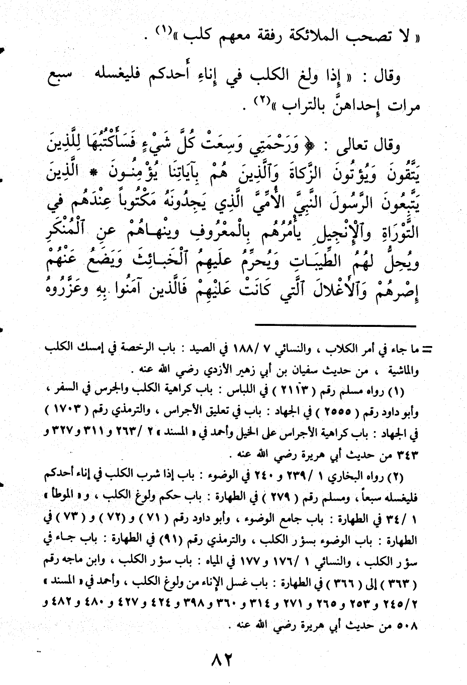 وقال: «لا تصحب الملائكة رفقة معه كلب» وقال: «إذا ولغ الكلب في إناء أحدكم فليغسله، سبع مرات إحداهن بالتراب» .