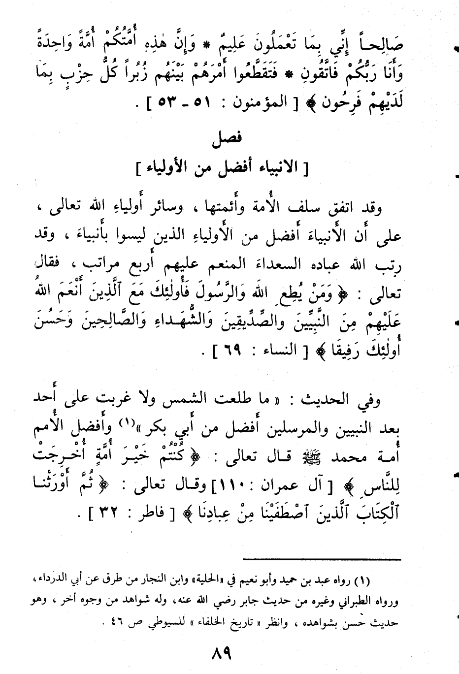 وفي الحديث: «ما طلعت الشمس ولا غربت على أحد بعد النبيين والمرسلين أفضل من أبي بكر» وأفضل الأمم أمة محمد صلى الله عليه وسلم قال تعالى: {كنتم خير أمة أخرجت للناس} وقال تعالى: {ثم أورثنا الكتاب الذين اصطفينا من عبادنا} .