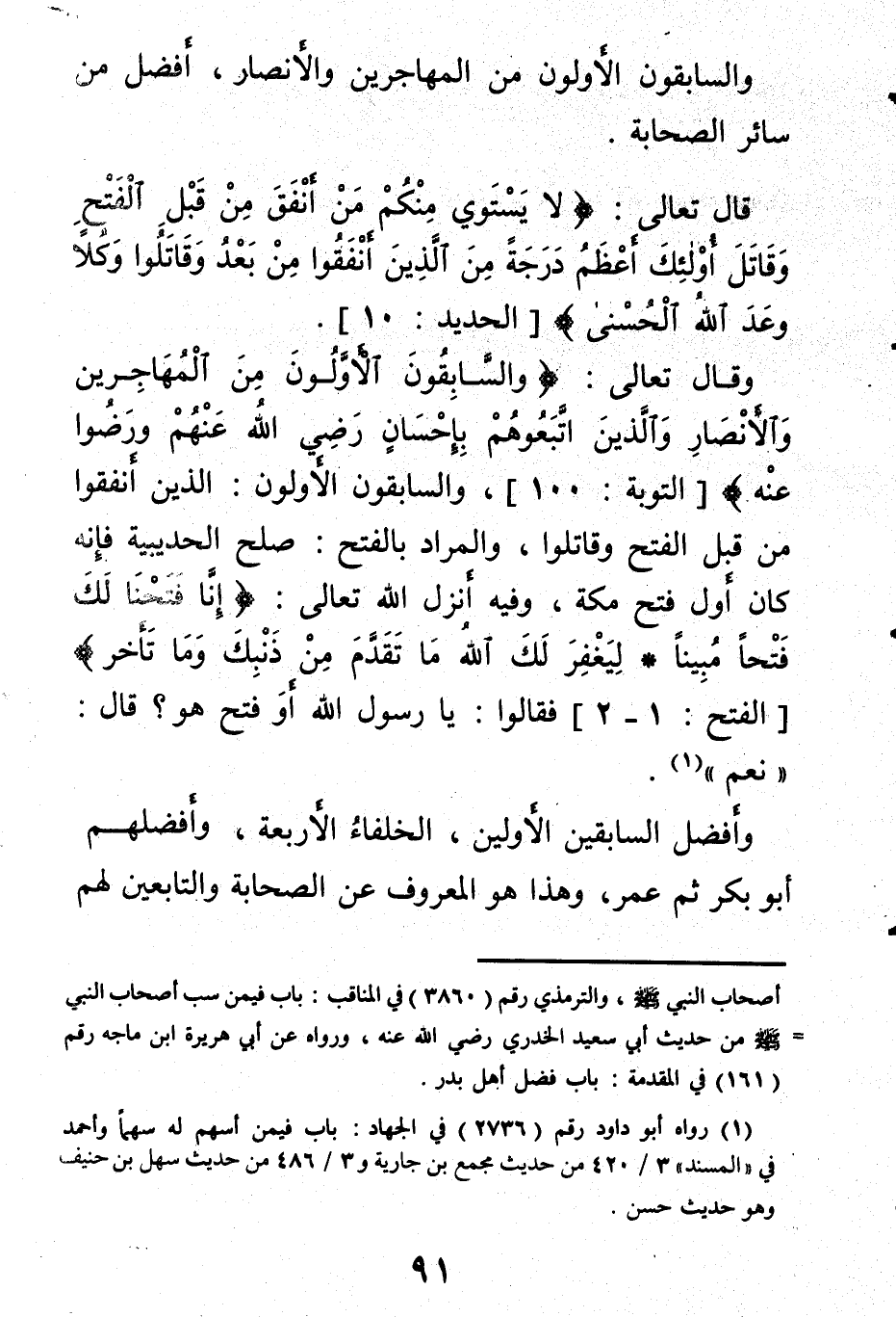 قال تعالى: {لا يستوي منكم من أنفق من قبل الفتح وقاتل أولئك أعظم درجة من الذين أنفقوا من بعد وقاتلوا وكلا وعد الله الحسنى} وقال تعالى: {والسابقون الأولون من المهاجرين والأنصار والذين اتبعوهم بإحسان رضي الله عنهم ورضوا عنه} والسابقون الأولون: الذين أنفقوا من قبل الفتح وقاتلوا، والمراد بالفتح: صلح الحديبية فإنه كان من أول فتح مكة، وفيه أنزل الله تعالى: {إنا فتحنا لك فتحا مبينا * ليغفر لك الله ما تقدم من ذنبك وما تأخر} فقالوا: يا رسول الله أو فتح هو؟ قال: «نعم» .