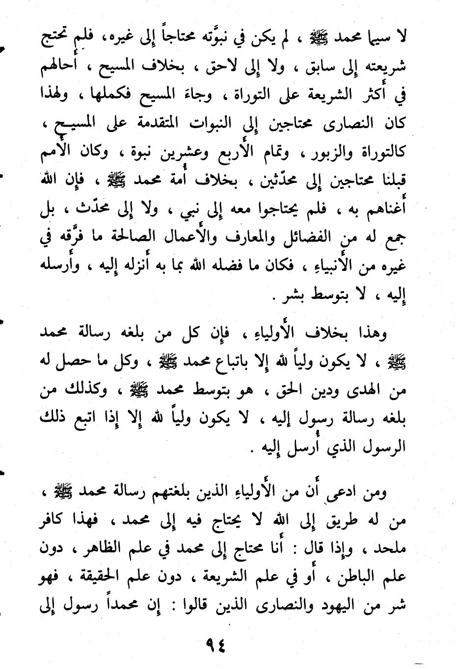 ومن ادعى أن من الأولياء بالذين بلغتهم رسالة محمد صلى الله عليه وسلم، من له طريق إلى الله لا يحتاج فيه إلى محمد، فهذا كافر ملحد، وإذا قال: أنا محتاج إلى محمد في علم الظاهر، دون علم الباطن، أو في علم الشريعة، دون علم الحقيقة، فهو شر من اليهود والنصارى الذين قالوا: إن محمدا رسول إلى