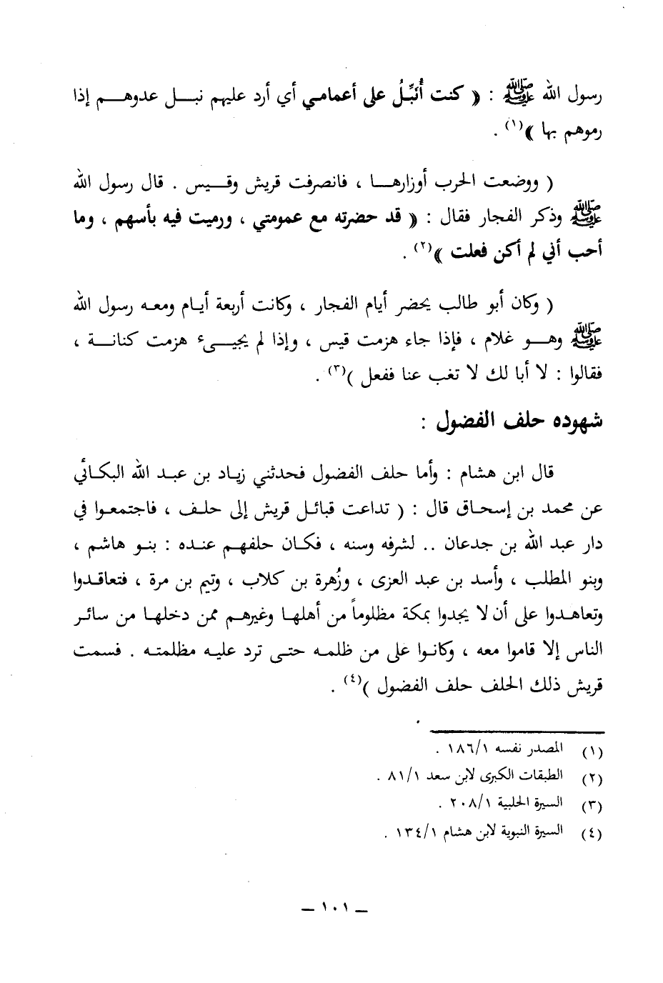 (ووضعت الحرب أوزارها، فانصرفت قريش وقيس. قال رسول الله - صلى الله عليه وسلم - وذكر الفجار فقال: ((قد حضرته مع عمومتي، ورميت فيه بأسهم، وما أحب أني لم أكن فعلت)) (¬2).