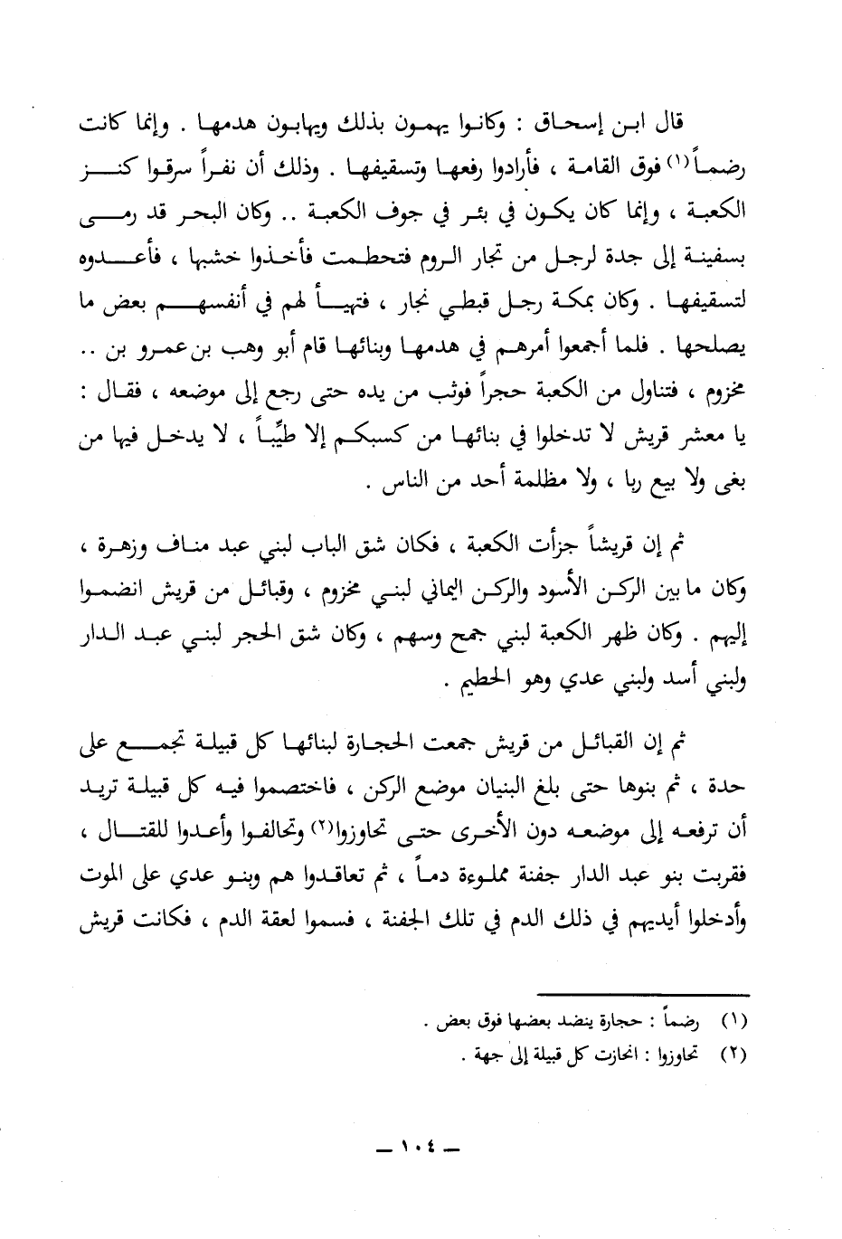 قال ابن إسحاق: وكانوا يهمون بذلك ويهابون هدمها. وإنما كانت رضما (¬1) فوق القامة، فأرادوا رفعها وتسقيفها. وذلك أن نفرا سرقوا كنز الكعبة، وإنما كان يكون في بئر في جوف الكعبة .. وكان البحر قد رمى بسفينة إلى جدة لرجل من تجار الروم فتحطمت فأخذوا خشبها، فأعدوه لتسقيفها. وكان بمكة رجل قبطي نجار، فتهيأ لهم في أنفسهم بعض ما يصلحها. فلما أجمعوا أمرهم في هدمها وبنائها قام أبو وهب بن عمرو بن .. مخزوم، فتناول من الكعبة حجرا فوثب من يده حتى رجع إلى موضعه، فقال: يا معشر قريش لا تدخلوا في بنائها من كسبكم إلاطيبا، لا يدخل فيها من بغي ولا بيع ربا، ولا مظلمة أحد من الناس.