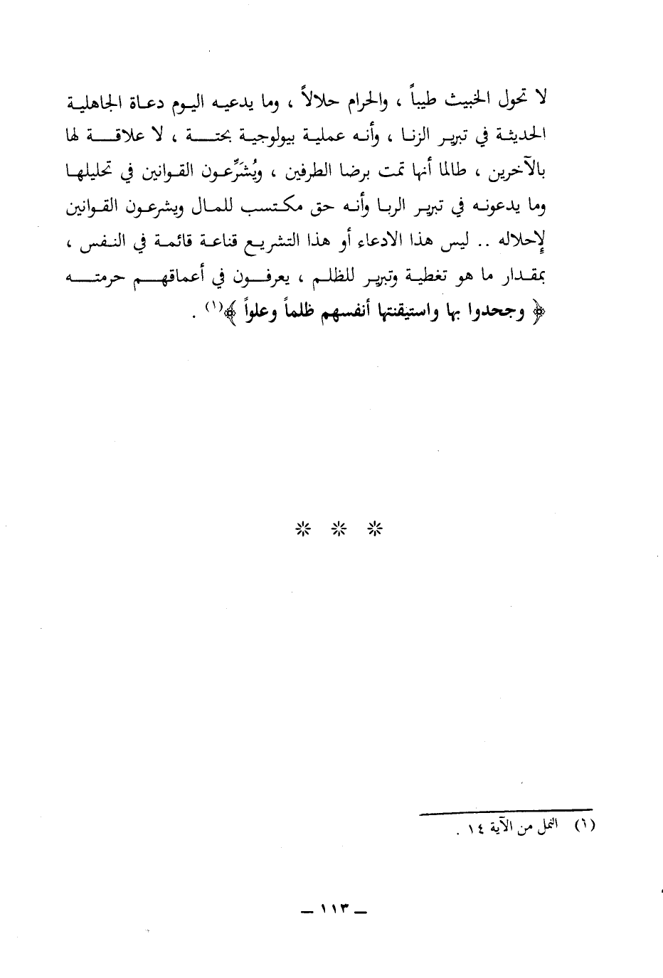 لا تحول الخبيت طيبا، والحرام حلالا، وما يدعيه اليوم دعاة الجاهلية الحديثة في تبرير الزنا، وأنه عملية بيولوجية بحتة، لا علاقة لها بالآخرين، طالما أنها تمت برضا الطرفين، ويشرعون القوانين في تحليلها وما يدعونه في تبرير الربا وأنه حق مكتسب للمال ويشرعون القوانين لإحلاله .. ليس هذا الادعاء أو هذا التشريع قناعة قائمة في النفس، بمقدار ما هو تغطية وتبرير للظلم، يعرفون في أعماقهم حرمته {وجحدوا بها واستيقنتها أنفسهم ظلما وعلوا} (¬1).