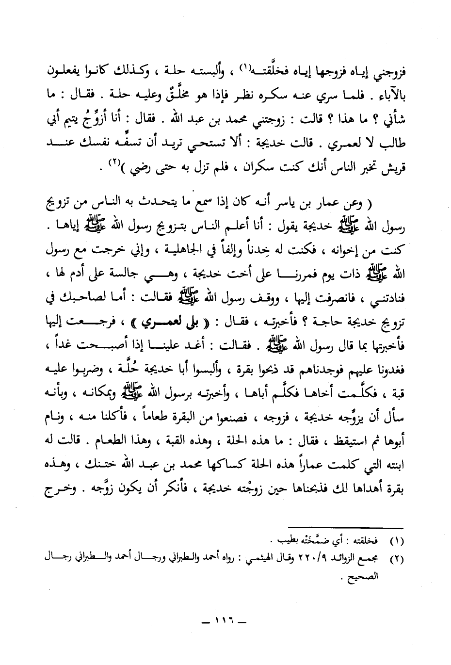 (وعن عمار بن ياسر أنه كان إذا سمع يتحدث به الناس من تزوج رسول الله خديجة يقول: أنا أعلم الناس بتزويج رسول الله - صلى الله عليه وسلم - إياها. كنت من إخوانه، فكنت له خدنا وإلفا في الجاهلية، وإني خرجت مع رسول الله - صلى الله عليه وسلم - ذات يوم فمررنا على أخت خديجة، وهي جالسة على أدم لها، فنادتني، فانصرفت إليها، ووقف رسول الله - صلى الله عليه وسلم - فقالت: أما لصاحبك في تزوج خديجة حاجة؟ فأخبرته، فقال: ((بلى لعمري))، فرجعت إليها فأخبرتها بما قال رسول الله - صلى الله عليه وسلم -. فقالت: أغد علينا إذا أصبحت غدا، فغدونا عليهم فوجدناهم قد ذبحوا بقرة، وألبسوا أبا خديجة حلة، وضربوا عليه قبة، فكلمت أخاها فكلم أباها، وأخبرته برسول الله - صلى الله عليه وسلم - وبمكانه، وبأنه سأل أن يزوجه خديجة، فزوجه، فصنعوا من البقرة طعاما، فأكلنا منه، ونام أبوها ثم استيقظ، فقال: ما هذه الحلة، وهذه القبة، وهذا الطعام. قالت له ابنته التي كلمت عمارا هذه الحلة كساكها محمد بن عبد الله ختنك، وهذه بقرة أهداها لك فذبحناها حين زوجته خديجة، فأنكر أن يكون زوجه. وخرج