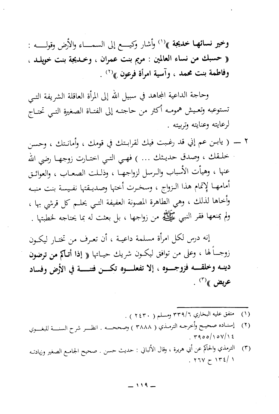 2 - (يابن عم إني قد رغبت فيك لقرابتك في قومك، وأمانتك، وحسن خلقك، وصدق حديثك ...) فهي التي اختارت زوجها رضي الله عنها، وهيأت الأسباب والرسل لزواجها، وذللت الصعاب، والعوائق أمامها لإتمام هذا الزواج، وسخرت أختها وصديقتها نفيسة بنت منبه وأخاها لذلك، وهي الطاهرة المصونة العفيفة التي يحلم كل قرشي بها، ولم يمنعها فقر النبي - صلى الله عليه وسلم - من زواجها، بل بعثت له بما يحتاجه لخطبتها.