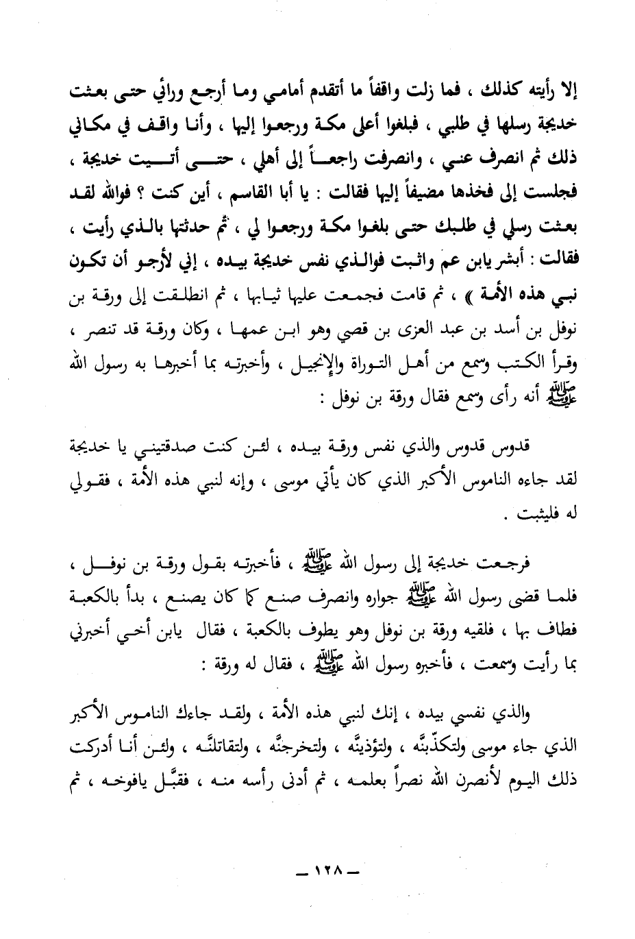 إلا رأيته كذلك، فما زلت واقفا ما أتقدم أمامي وما أرجع ورائي حتى بعثت خديجة رسلها في طلبي، فبلغوا أعلى مكة ورجعوا إليها، وأنا واقف في مكاني ذلك ثم انصرف عني، وانصرفت راجعا إلى أهلي، حتى أتيت خديجة، فجلست إلى فخذها مضيفا إليها فقالت: يا أبا القاسم، أين كنت؟ فوالله لقد بعثت رسلي في طلبك حتى بلغوا مكة ورجعوا لي، ثم حدثتها بالذي رأيت، فقالت: أبشر يابن عم واثبت فوالذي نفس خديجة بيده، إني لأرجو أن تكون نبي هذه الأمة))، تم قامت فجمعت عليها ثيابها، ثم انطلقت إلى ورقة بن نوفل بن أسد بن عبد العزى بن قصي وهو ابن عمها، وكان ورقة قد تنصر، وقرأ الكتب وسمع من أهل التوراة والإنجيل، وأخبرته بما أخبرها به رسول الله - صلى الله عليه وسلم - أنه رأى وسمع فقال ورقة بن نوفل: