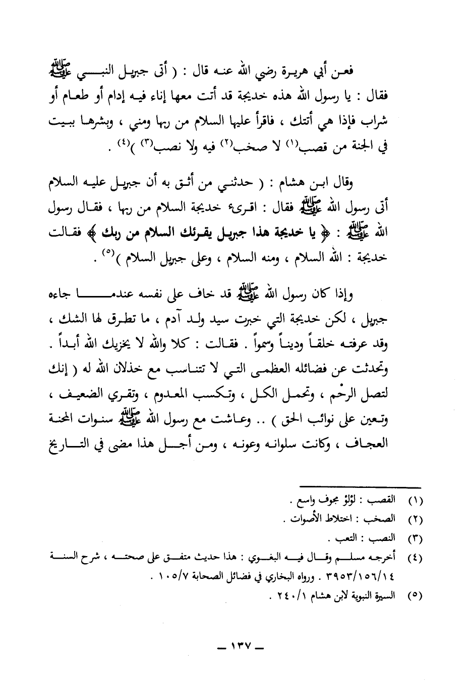وقال ابن هشام: (حدثني من أثق به أن جبريل عليه السلام أتى رسول الله - صلى الله عليه وسلم - فقال: اقرىء خديجة السلام من ربها، فقال رسول الله - صلى الله عليه وسلم -: (يا خديجة هذا جبريل يقرئك السلام من ربك) فقالت خديجة: الله السلام، ومنه السلام، وعلى جبريل السلام) (¬5).