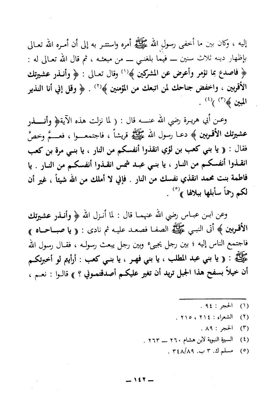 وعن أبي هريرة ورضي الله عنه قال: (لما نزلت هذه الآية {وأنذر عشيرتك الأقربين} دعا رسول الله (ص) قريشا، فاجتمعوا، فعم وخص فقال: {يا بني كعب بن لؤي انقذوا أنفسكم من النار، يا بني مرة بن كعب انقذوا أنفسكم من النار، يا بني عبد شمس انقذوا أنفسكم من النار. يا فاطمة بنت محمد انقذي نفسك من النار. فإني لا أملك من الله شيئا، غير أن لكم رحما سأبلها ببلالها)) (¬5).