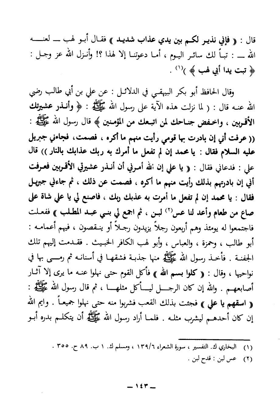 وقال الحافظ أبو بكر البيهقي في الدلائل: عن علي بن أبي طالب رضي الله عنه قال: (لما نزلت هذه الآية على رسول الله (ص): {وأنذر عشيرتك الأقربين واخفض جناحك لمن اتبعك من المؤمنين} قال رسول الله (ص): ((عرفت أني إن بادرت بها قومي رأيت منهم ما أكره، فصمت، فجاءني جبريل عليه السلام فقال: يا محمد إن لم تفعل ما أمرك به ربك عذبك بالنار)) قال علي: فدعاني فقال: ((يا علي إن الله أمرني أن أنذر عشيرتي الأقربين فعرفت أني إن بادرتهم بذلك رأيت منهم ما أكره، فصمت عن ذلك، ثم جاءني جبريل فقال: يا محمد إن لم تفعل ما أمرت به عذبك ربك، فاصنع لي يا علي شاة على صاع من طعام وأعد لنا عس (¬2) لبن، ثم اجمع لي بني عبد المطلب)) ففعلت فاجتمعوا له يومئذ وهم أربعون رجلا يزيدون رجلا أو ينقصون، فيهم أعمامه: أبو طالب، وحمزة، والعباس، وأبو لهب الكافر الخبيث. فقدمت إليهم تلك الجفنة. فأخذ رسول الله (ص) منها جذبة فشقها في أسنانه ثم رمى بها في نواحيها، وقال: ((كلوا بسم الله)) فأكل القوم حتى نهلوا عنه ما يرى إلا آثار أصابعهم. والله إن كان الرجل ليأكل مثلها، ثم قال رسول الله (ص): ((اسقهم يا علي)) فجئت بذلك القعب فشربوا منه حتى نهلوا جميعا. وايم الله إن كان أحدهم ليشرب مثله. فلما أرد رسول الله (ص) أن يتكلم بدره أبو