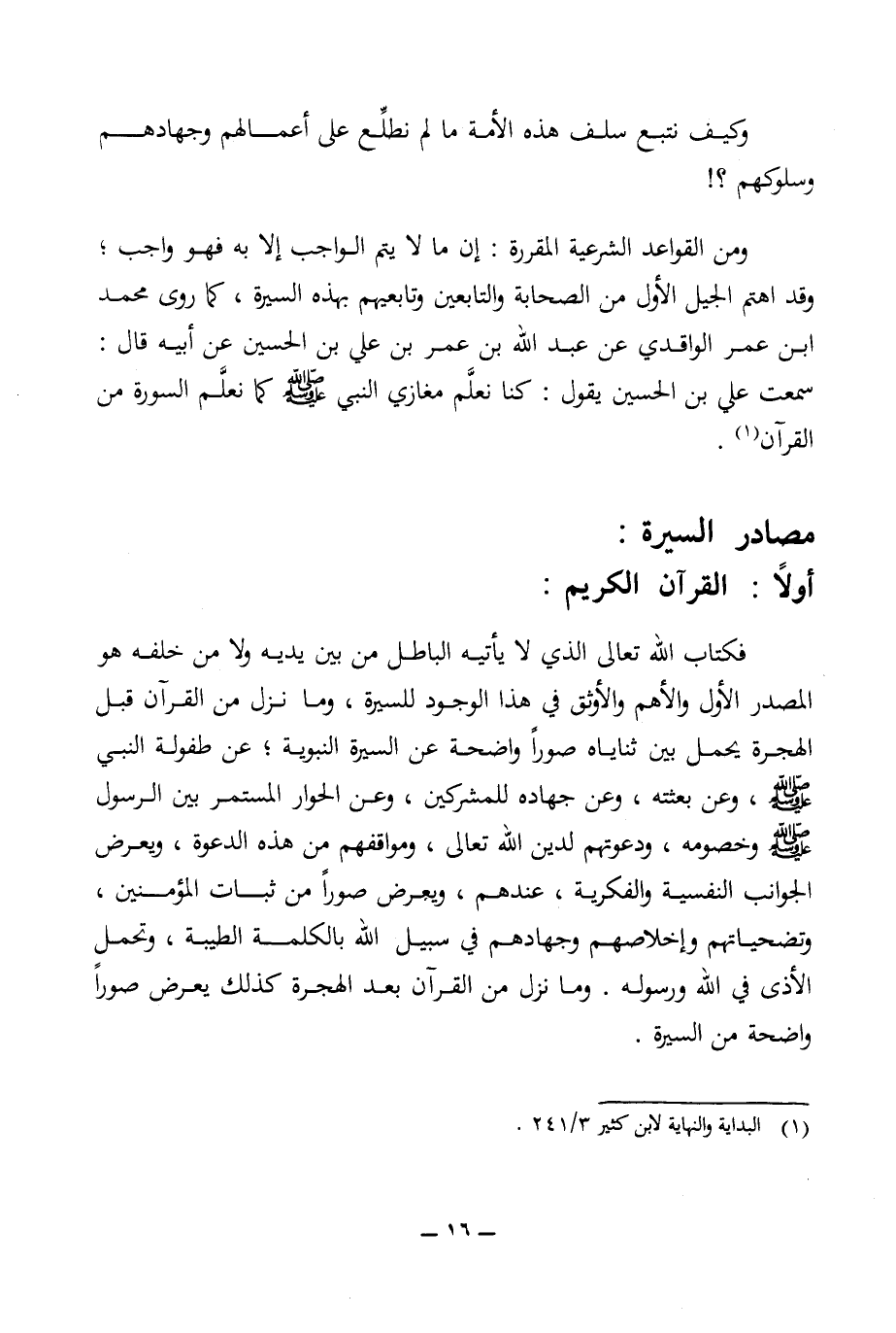ومن القواعد الشرعية المقررة: إن ما لا يتم الواجب إلا به فهو واجب؛ وقد اهتم الجيل الأول من الصحابة والتابعين وتابعيهم بهذه السيرة، كما روى محمد ابن عمر الواقدي عن عبد الله بن عمر بن علي بن الحسين عن أبيه قال: سمعت علي بن الحسين يقول: كنا نعلم مغازي النبي - صلى الله عليه وسلم - كما نعلم السورة من القرآن (¬1).
