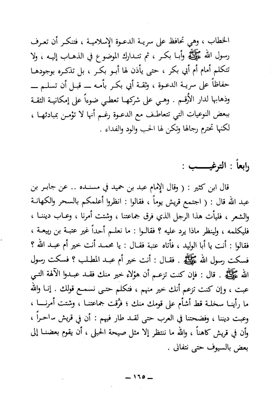 قال ابن كثير: (وقال الإمام عبد بن حميد في مسده .. عن جابر بن عبد الله قال: (اجتمع قريش يوما، فقالوا: انظروا أعلمكم بالسحر والكهانة والشعر، فليأت هذا الرجل الذي فرق جماعتنا، وشتت أمرنا، وعاب ديننا، فليكلمه، ولينظر ماذا يرد عليه؟ فقالوا: ما نعلم أحدا غير عتبة بن ربيعة، فقالوا: أنت يا أبا الوليد، فأتاه عتبة فقال: يا محمد أنت خير أم عبد الله؟ فسكت رسول الله (ص). فقال: أنت خير أم عبد المطلب؟ فسكت رسول الله (ص). قال: فإن كنت تزعم أن هؤلاء خير منك فقد عبدوا الآلهة التي عبت، وإن كنت تزعم أنك خير منهم، فتكلم حتى نسمع قولك. إنا بالله ما رأينا سخلة قط أشأم على قومك منك؛ فرقت جماعتنا، وشتت أمرنا، وعبت ديننا، وفضحتنا في العرب حتى لقد طار فيهم: أن في قريش ساحرا، وأن في قريش كاهنا، والله ما ننتظر إلا مثل صيحة الحبلى، أن يقوم بعضنا إلى بعض بالسيوف حتى نتفانى.