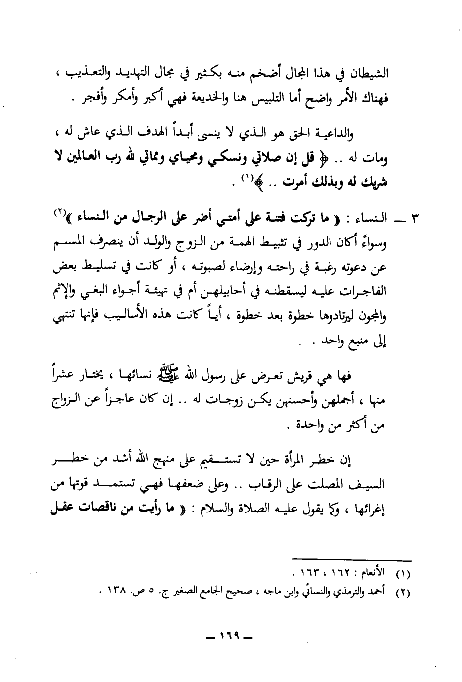 3 - النساء: ((ما تركت فتنة على أمتي أضر على الرجال من النساء)) (¬2) وسواء أكن الدور في تثبيط الهمة من الزوج والولد أن ينصرف المسلم عن دعوته رغبة في راحته وإرضاء لصبوته، أو كانت في تسليط بعض الفاجرات عليه ليسقطنه في أحابيلهن أم في تهيئة أجواء البغي والإثم والمجون ليرتادوها خطوة بعد خطوة، أيا كانت هذه الأساليب فإنها تنتهي إلى منبع واحد.