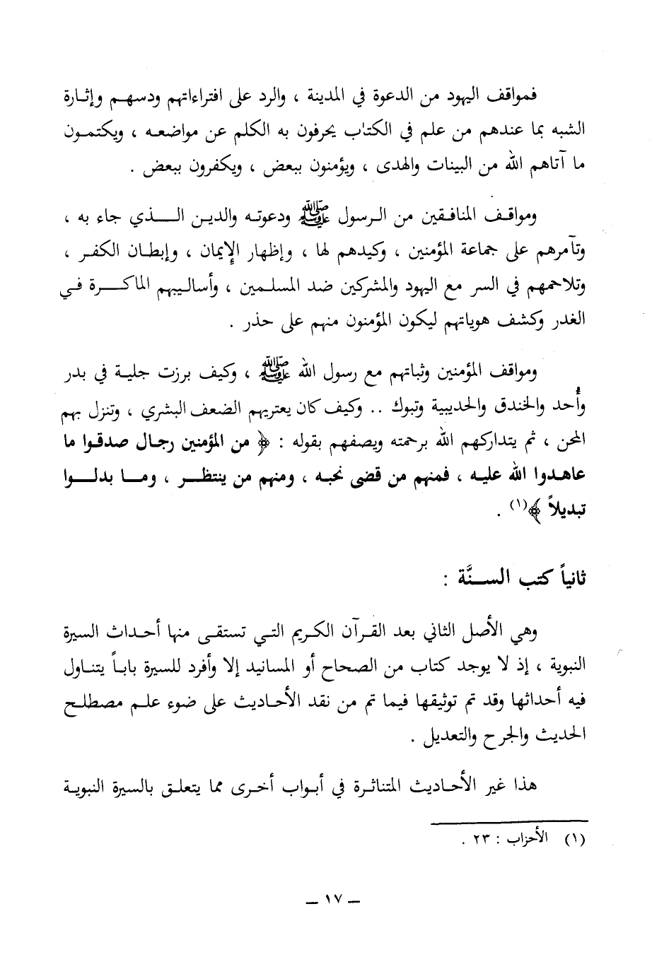 ومواقف المؤمنين وثباتهم مع رسول الله - صلى الله عليه وسلم -، وكيف برزت جلية في بدر واحد والخندق والحديبية وتبوك .. كيف كان يعتريهم الضعف البشري، وتنزل بهم المحن، ثم يتداركهم الله برحمته ويصفهم بقوله: {من المؤمنين رجال صدقوا ما عاهدوا الله عليه فمنهم من قضى نحبه ومنهم من ينتظر وما بدلوا تبديلا} (¬1).